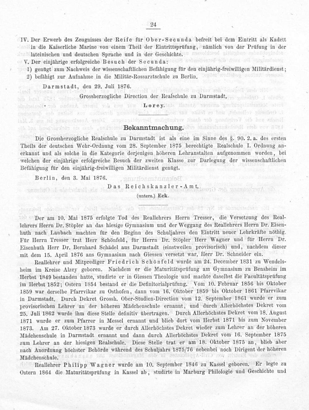 Darmstadt, den 29. Juli 1876. Grossherzogliche Direction der Realschule zu Darmstadt. . Lorey.