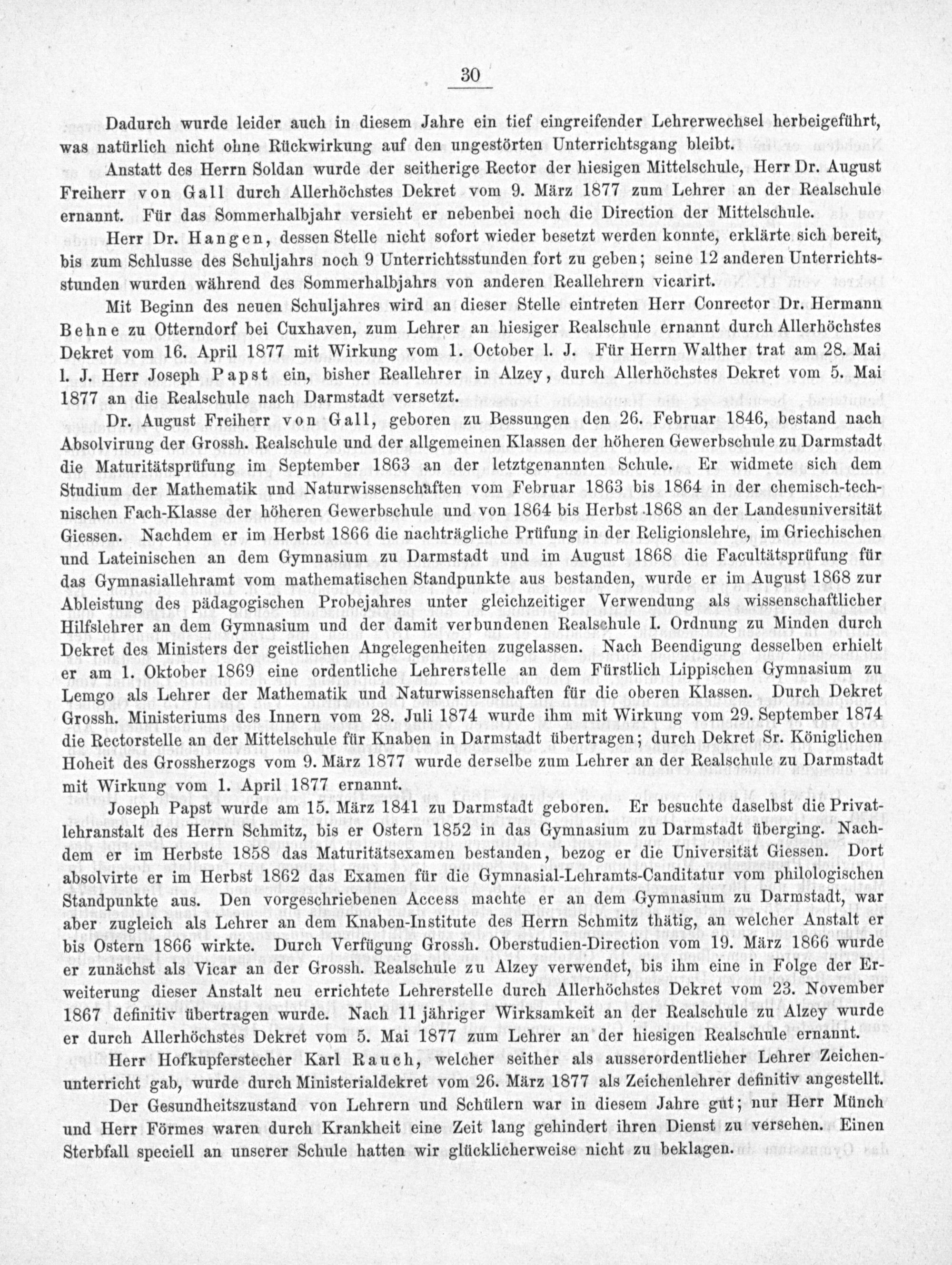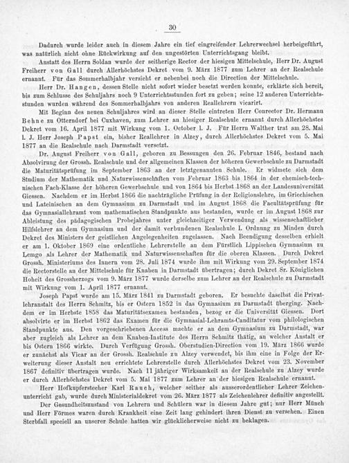 Mit Beginn des neuen Schuljahres wird an dieser Stelle eintreten Herr Conrector Dr. Hermann Behne zu Otterndorf bei Cuxhaven, zum Lehrer an hiesiger Realschule ernannt durch Allerhöchstes Dekret vom 16. April 1877 mit Wirkung vom 1. October l. J. Für Herrn Walther trat am 28. Mai I. J. Herr Joseph Papst ein, bisher Reallehrer in Alzey, durch Allerhöchstes Dekret vom 5. Mai 1877 an die Realschule nach Darmstadt versetzt.