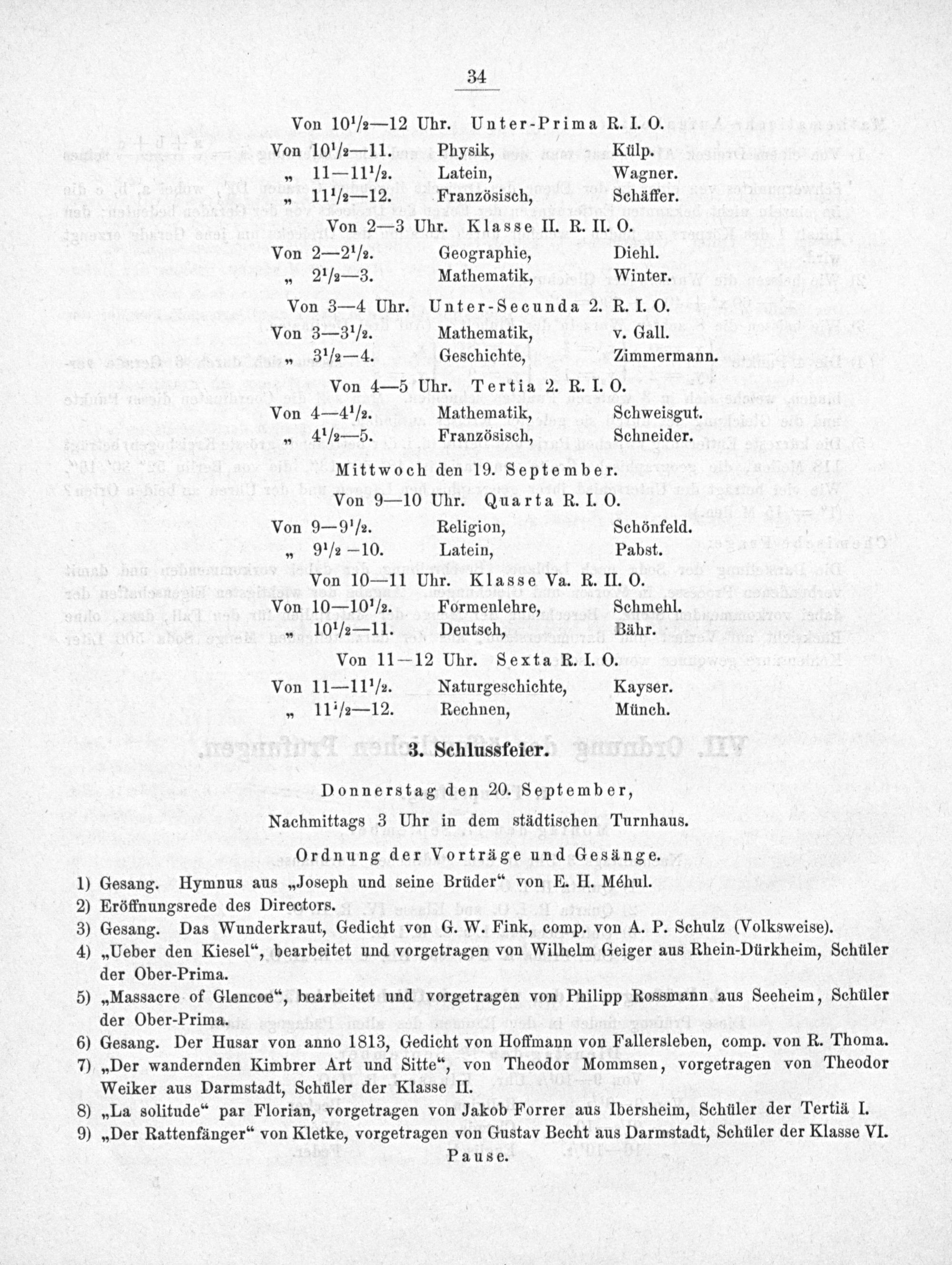 Von 10 ½— 11. Physik, Külp. „ 11— 11 ½2. Latein, Wagner. „ 11 ½— 12. Französisch, Schäffer. Von 2—3 Uhr. Klasse II. R. II. O. Von 2— 2 ½. Geographie, Diehl. „ 2 ½— 3. Mathematik, Winter. Von 3—4 Uhr. Unter-Secunda 2. R. I. O. Von 3— 3 ½. Mathematik, v. Gall. „ 3 ½— 4. Geschichte, Zimmermann. Von 4—5 Uhr. Tertia 2. R. I. O. Von 4—4 ½. Mathematik, Schweisgut. „ 4 ½— 5. Französisch, Schneider.