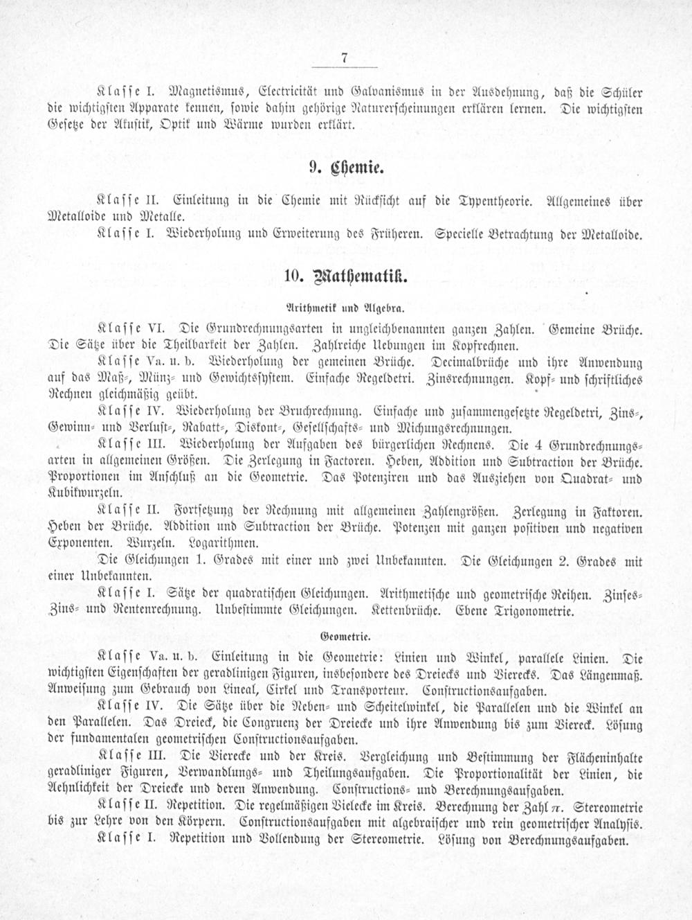 Klaſſe II. Repetition. Die regelmäßigen Vielecke im Kreis. Berechnung der Zahl. Stereometrie bis zur Lehre von den Körpern. Conſtructionsaufgaben mit algebraiſcher und rein geometriſcher Analyſis.