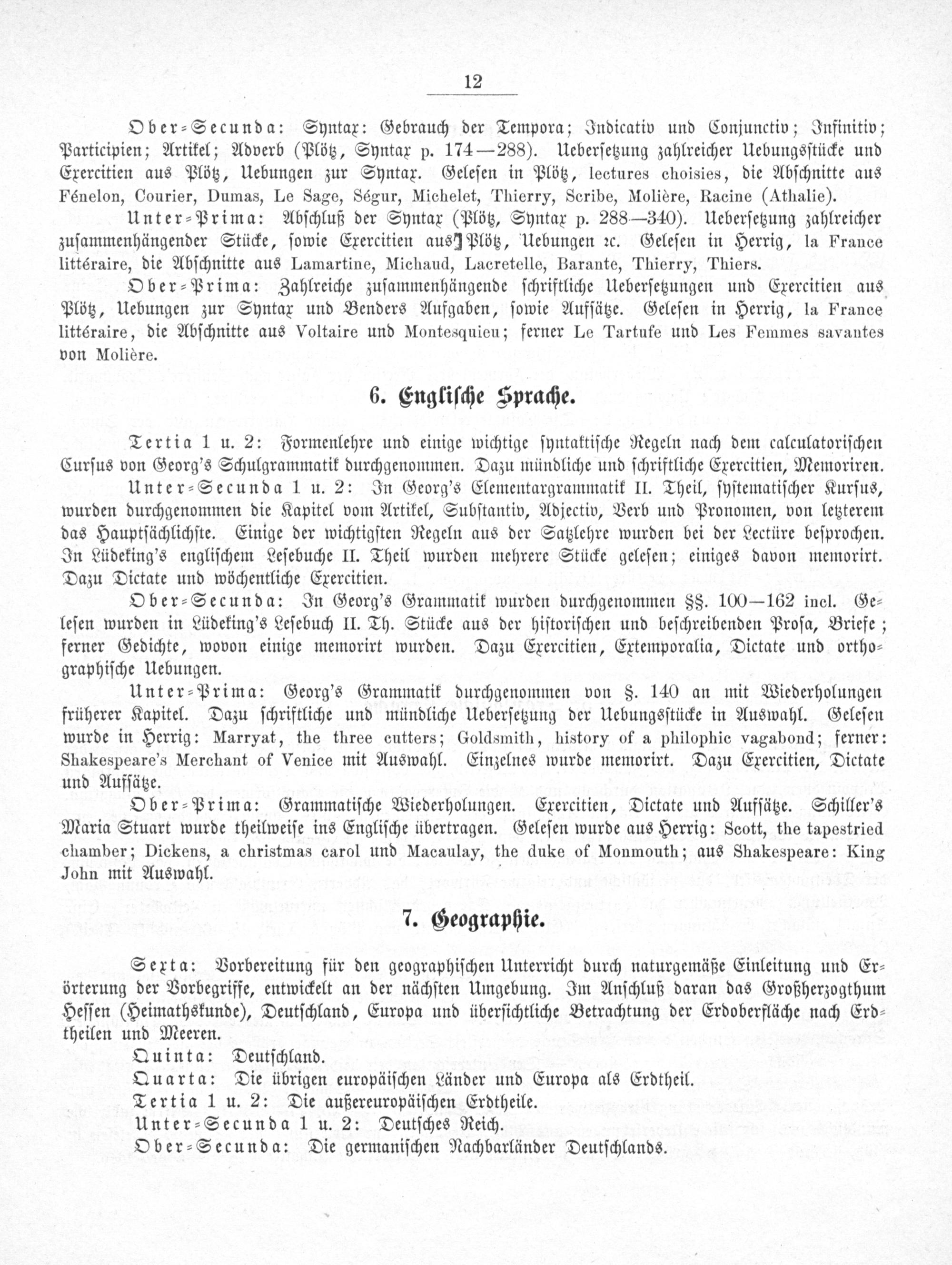 Unter⸗Secunda 1 u. 2: In Georg's Elementargrammatik II. Theil, ſyſtematiſcher Kurſus, wurden durchgenommen die Kapitel vom Artikel, Subſtantiv, Adjectiv, Verb und Pronomen, von letzterem das Hauptſächlichſte. Einige der wichtigſten Regeln aus der Satzlehre wurden bei der Lectüre beſprochen. In Lüdeking's engliſchem Leſebuche II. Theil wurden mehrere Stücke geleſen; einiges davon memorirt. Dazu Dictate und wöchentliche Exercitien.