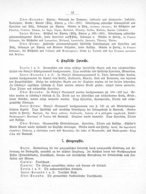 Ober⸗Secunda: In Georg's Grammatik wurden durchgenommen§§. 100— 162 inel. Ge⸗ leſen wurden in Lüdeking's Leſebuch II. Th. Stücke aus der hiſtoriſchen und beſchreibenden Proſa, Briefe; ferner Gedichte, wovon einige memorirt wurden. Dazu Exercitien, Extemporalia, Dictate und ortho⸗ graphiſche Uebungen.