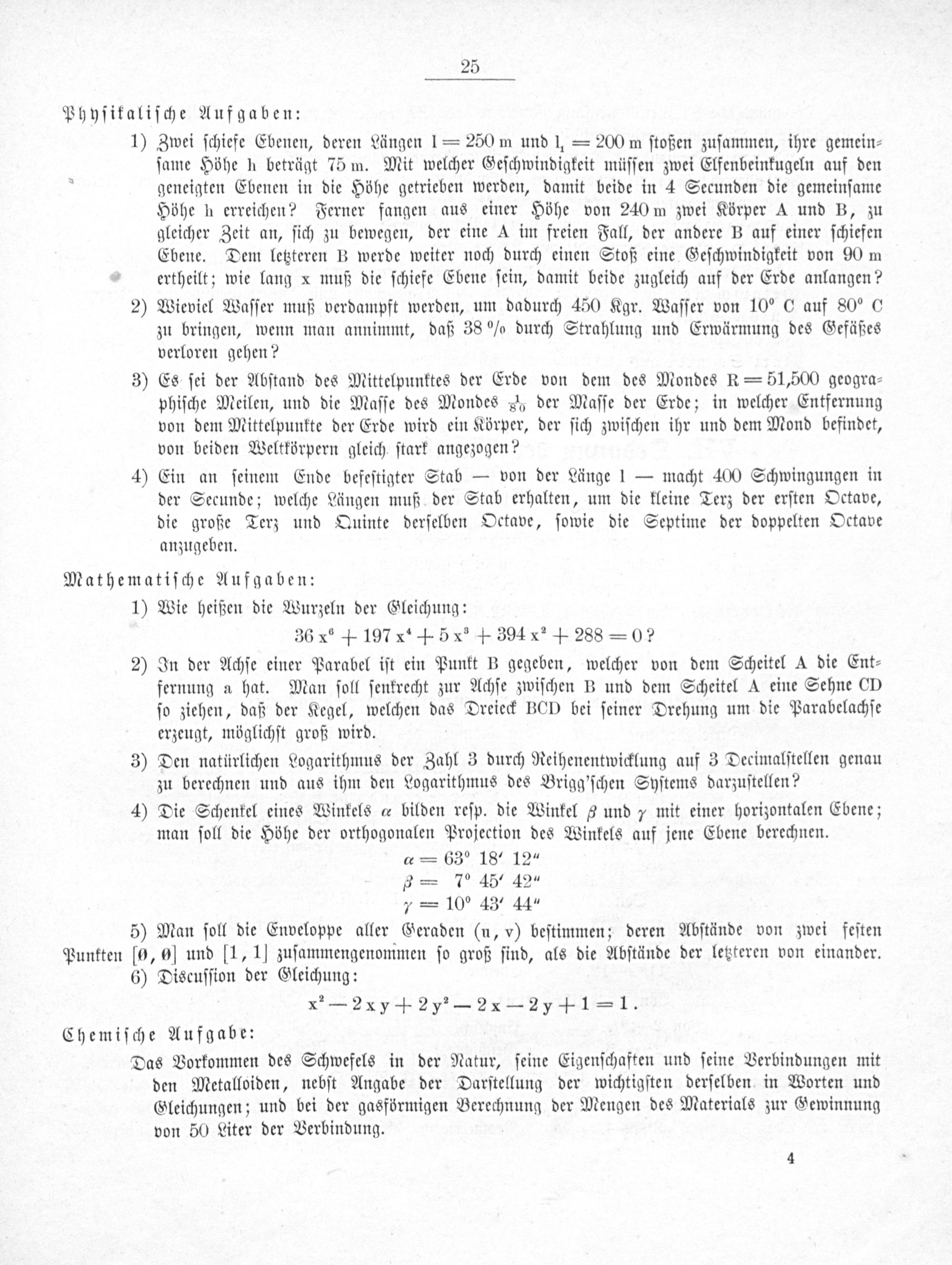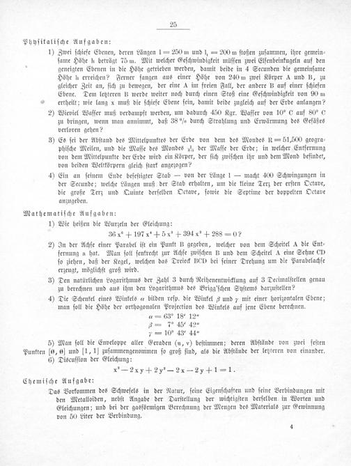 A= 63⁰° 18 12“ 9= 7° 45 42“ 7= 10⁰° 43 44“ 5) Man ſoll die Enveloppe aller Geraden(u, v) beſtimmen; deren Abſtände von zwei feſten Punkten[0, 0] und[1, 1] zuſammengenommen ſo groß ſind, als die Abſtände der letzteren von einander. 6) Discuſſion der Gleichung: xX*— 2Xy+ 2y*— 2xX— 2py+† 1=1. Chemiſche Aufgabe: