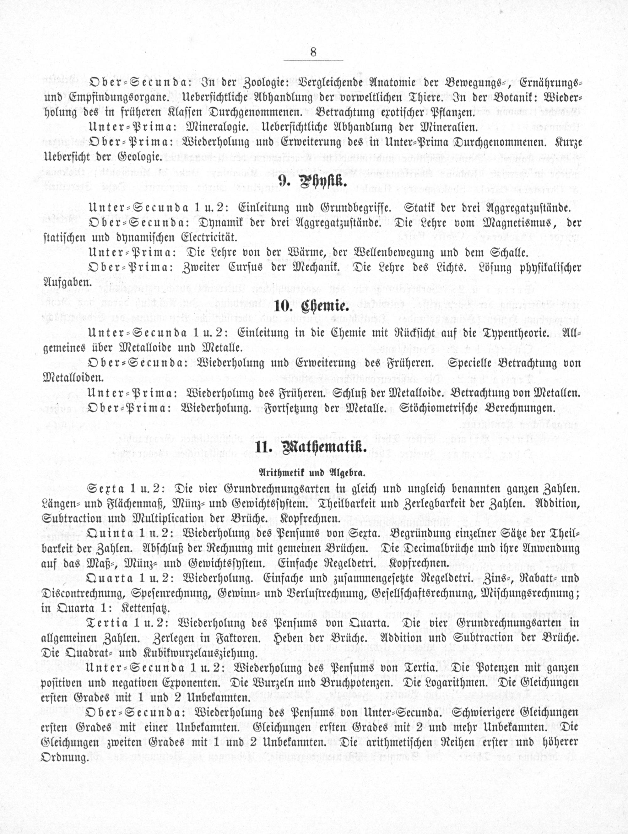 Ober⸗Secunda: Wiederholung des Penſums von Unter⸗Secunda. Schwierigere Gleichungen erſten Grades mit einer Unbekannten. Gleichungen erſten Grades mit 2 und mehr Unbekannten. Die Gleichungen zweiten Grades mit 1 und 2 Unbekannten. Die arithmetiſchen Reihen erſter und höherer Ordnung.