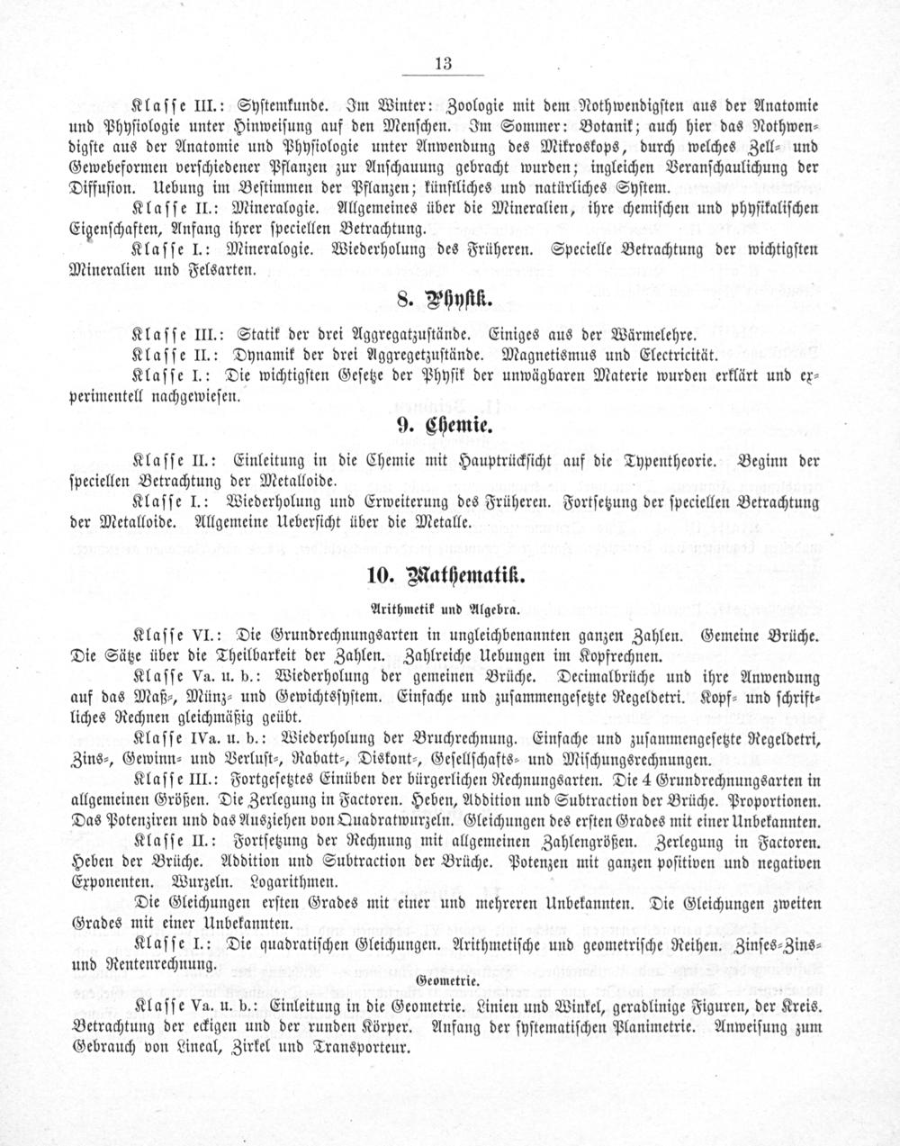 Klaſſe III.: Syſtemkunde. Im Winter: Zoologie mit dem Nothwendigſten aus der Anatomie und Phyſiologie unter Hinweiſung auf den Menſchen. Im Sommer: Botanik; auch hier das Nothwen⸗ digſte aus der Anatomie und Phyſiologie unter Anwendung des Mikroskops, durch welches Zell⸗ und Gewebeformen verſchiedener Pflanzen zur Anſchauung gebracht wurden; ingleichen Veranſchaulichung der Diffuſion. Uebung im Beſtimmen der Pflanzen; künſtliches und natürliches Syſtem.