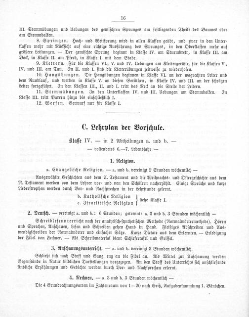 Ausgewählte Geſchichten aus dem A. Teſtament und die Weihnachts⸗ und Oſtergeſchichte aus dem N. Teſtament werden von dem Lehrer vor⸗ und von den Schülern nacherzählt. Einige Sprüche und kurze Liederſtrophen werden durch Vor⸗ und Nachſprechen in der Lehrſtunde gelernt. b. Katholiſche Religion 3 c. Iſraelitiſche Religion Klaſje 1.