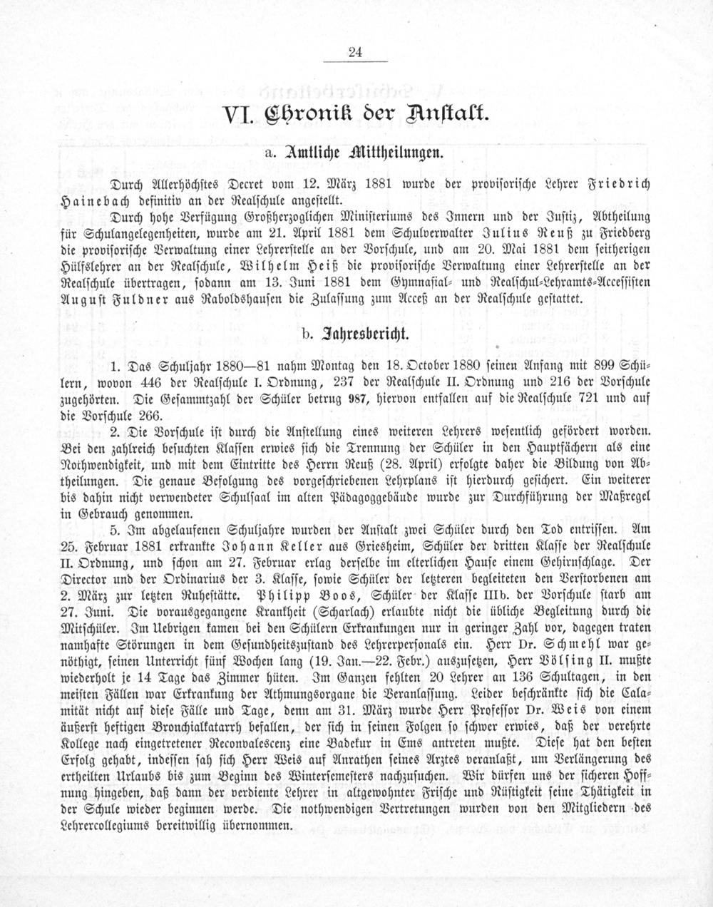 Durch hohe Verfügung Großherzoglichen Miniſteriums des Innern und der Juſtiz, Abtheilung für Schulangelegenheiten, wurde am 21. April 1881 dem Schulverwalter Julius Reuß zu Friedberg die proviſoriſche Verwaltung einer Lehrerſtelle an der Vorſchule, und am 20. Mai 1881 dem ſeitherigen Hülfslehrer an der Realſchule, Wilhelm Heiß die proviſoriſche Verwaltung einer Lehrerſtelle an der Realſchule übertragen, ſodann am 13. Juni 1881 dem Gymnaſial⸗ und Realſchul⸗Lehramts⸗Acceſſiſten Auguſt Fuldner aus Raboldshauſen die Zulaſſung zum Acceß an der Realſchule geſtattet.