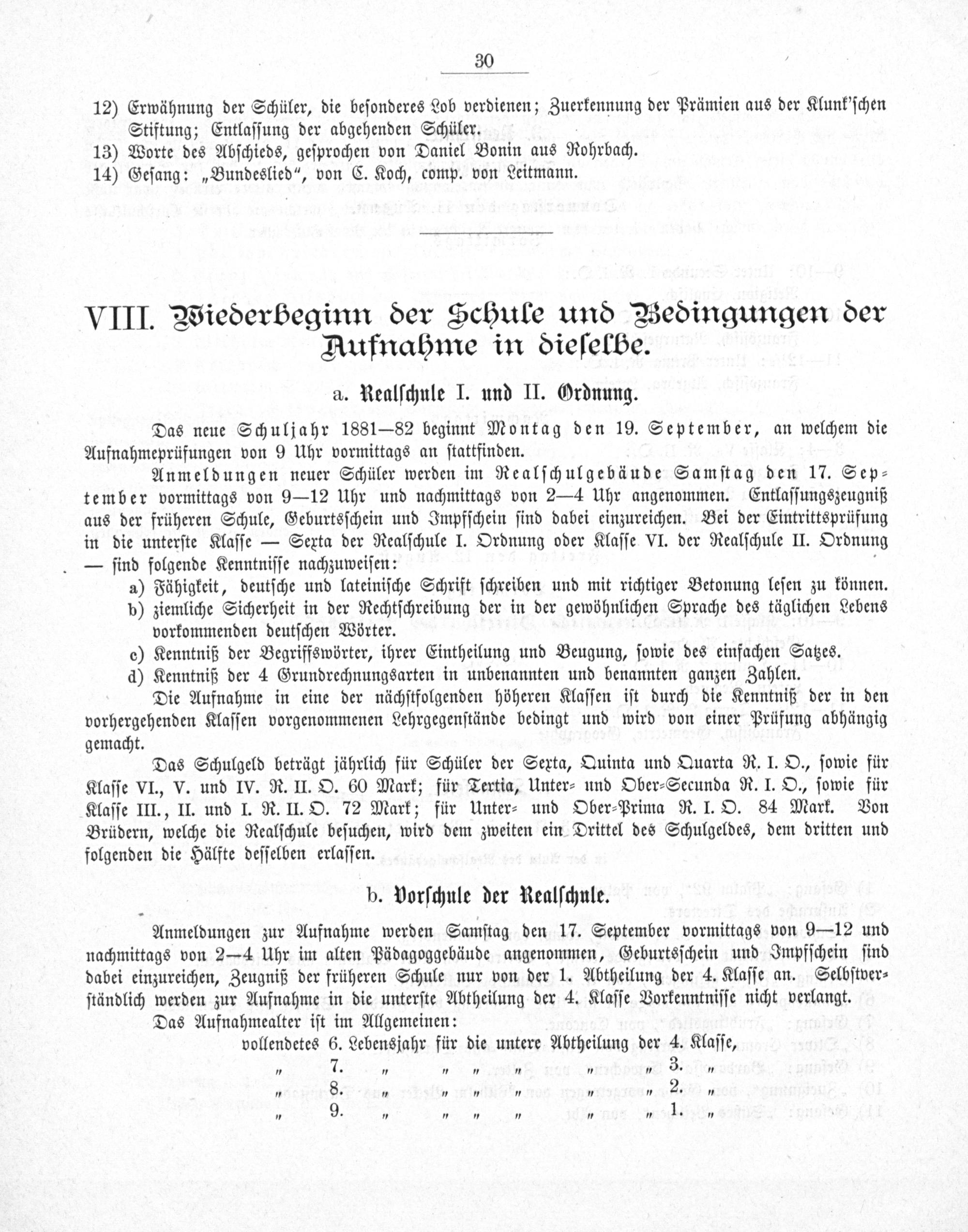 VIII. Wiederbeginn der Schule und Bedingungen der Aufnahme in dieſelbe.