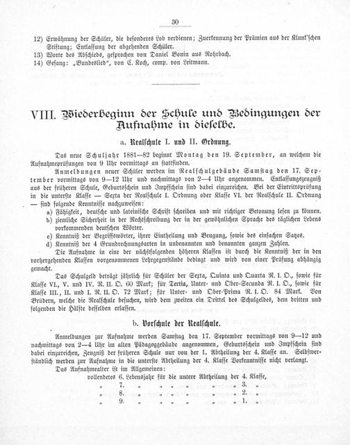 Anmeldungen zur Aufnahme werden Samſtag den 17. September vormittags von 9—12 und nachmittags von 2—4 Uhr im alten Pädagoggebäude angenommen, Geburtsſchein und Impfſchein ſind dabei einzureichen, Zeugniß der früheren Schule nur von der 1. Abtheilung der 4. Klaſſe an. Selbſtver⸗ ſtändlich werden zur Aufnahme in die unterſte Abtheilung der 4. Klaſſe Vorkenntniſſe nicht verlangt.