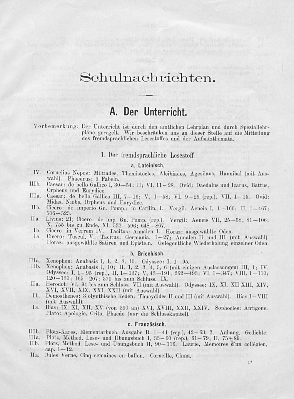hb. Griechisch. Xenophon: Anabasis I, 1. 2, 8, 10. Odyssee: I, 1— 95. Xenophon: Anabasis I, 10; II, 1, 2, 3, 4, 5, 6(mit einigen Auslassungen) III, 1; IV. Odyssee: I. 1— 95(rep.), II, 1—137; V, 43— 191; 262— 493; VI, 1— 347; VIII, 1— 110; 120— 130; 165— 207; 370 bis zum Schluss. IX. Herodot: VI, 94 bis zum Schluss, VII(mit Auswahl). Odyssee: IX, XI, XII XIII, XIV, XVI, XVII, XIX, XXI, XXII(mit Auswahl). Demosthenes: 3 olynthische Reden; Thucydides II und III(mit Auswahl). Ilias I-VIII (mit Auswahl). Ilias: IX, XI, XII, XV(von 390 an) XVI, XVIII, XXII, XXIV. Sophocles: Antigone. Plato: Apologie, Crito, Phaedo(nur die Schlusskapitel).
