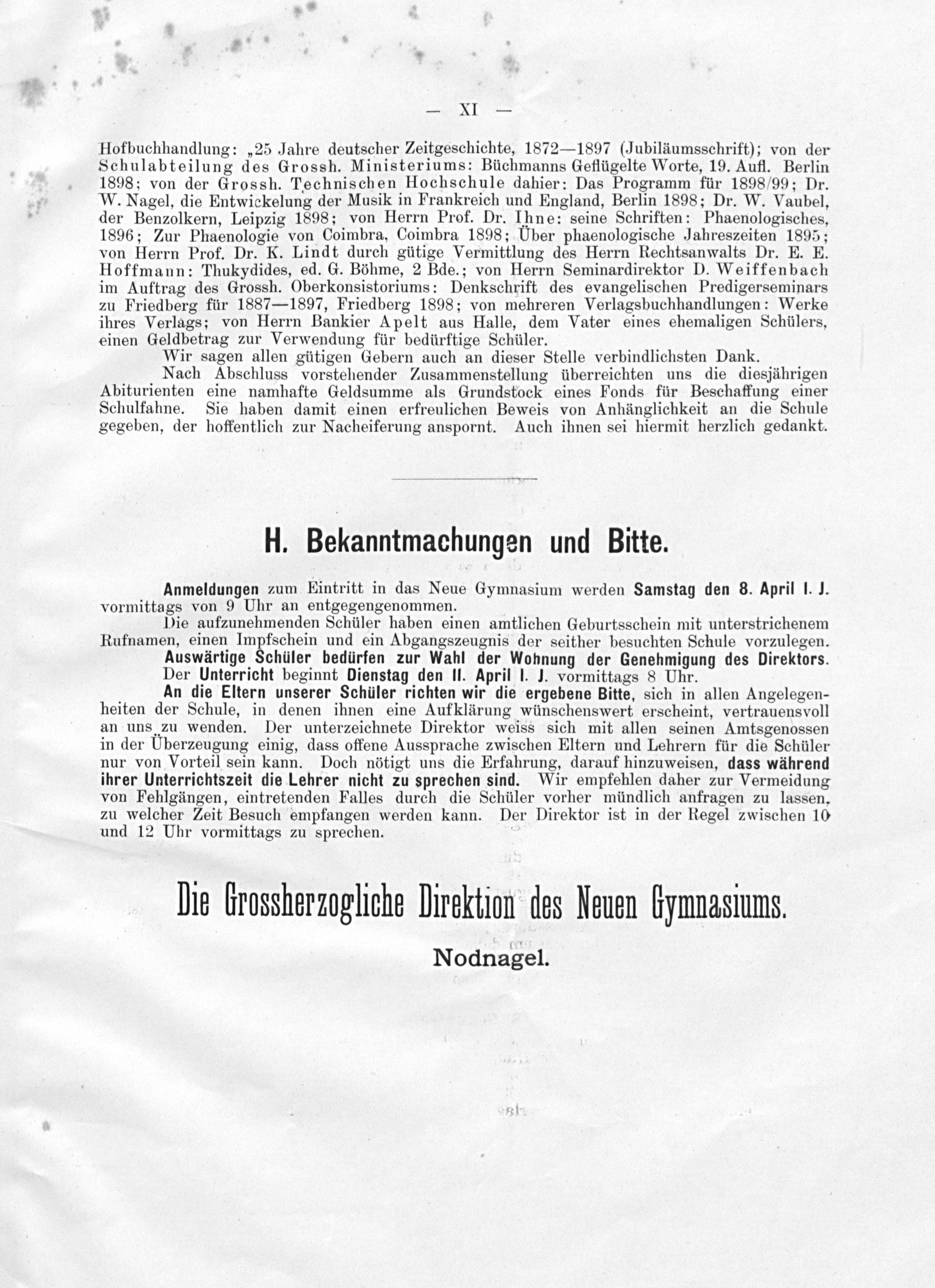Hofbuchhandlung:„25 Jahre deutscher Zeitgeschichte, 1872— 1897(Jubiläumsschrift); von der Schulabteilung des Grossh. Ministeriums: Büchmanns Geflügelte Worte, 19. Aufl. Berlin 1898; von der Grossh. Technischen Hochschule dahier: Das Programm für 1898/99; Dr. W. Nagel, die Entwickelung der Musik in Frankreich und England, Berlin 1898; Dr. W. Vaubel, der Benzolkern, Leipzig 1898; von Herrn Prof. Dr. Ihne: seine Schriften: Phaenologisches, 1896; Zur Phaenologie von Coimbra, Coimbra 1898; Uber phaenologische Jahreszeiten 1895; von Herrn Prof. Dr. K. Lindt durch gütige Vermittlung des Herrn Rechtsanwalts Dr. E. E. Hoffmann: Thukydides, ed. G. Böhme, 2 Bde.; von Herrn Seminardirektor D. Weiffenbach im Auftrag des Grossh. Oberkonsistoriums: Denkschrift des evangelischen Predigerseminars zu Friedberg für 1887— 1897, Friedberg 1898; von mehreren Verlagsbuchhandlungen: Werke ihres Verlags; von Herrn Bankier Apelt aus Halle, dem Vater eines ehemaligen Schülers, einen Geldbetrag zur Verwendung für bedürftige Schüler.