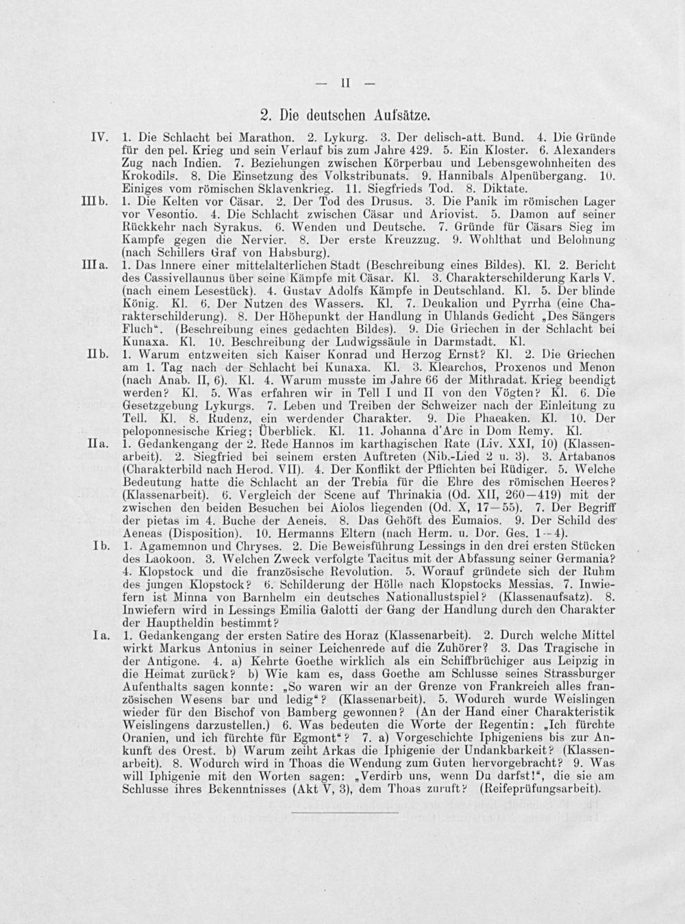 1. Das Innere einer mittelalterlichen Stadt(Beschreibung eines Bildes). Kl. 2. Bericht des Cassivellaunus über seine Kämpfe mit Cäsar. Kl. 3. Charakterschilderung Karls V. (nach einem Lesestück). 4. Gustav Adolfs Kämpfe in Deutschland. Kl. 5. Der blinde König. Kl. 6. Der Nutzen des Wassers. Kl. 7. Deukalion und Pyrrha(eine Cha- rakterschilderung). 8. Der Höhepunkt der Handlung in Uhlands Gedicht„Des Sängers Fluch“.(Beschreibung eines gedachten Bildes). 9. Die Griechen in der Schlacht bei Kunaxa. Kl. 10. Beschreibung der Ludwigssäule in Darmstadt. Kl.