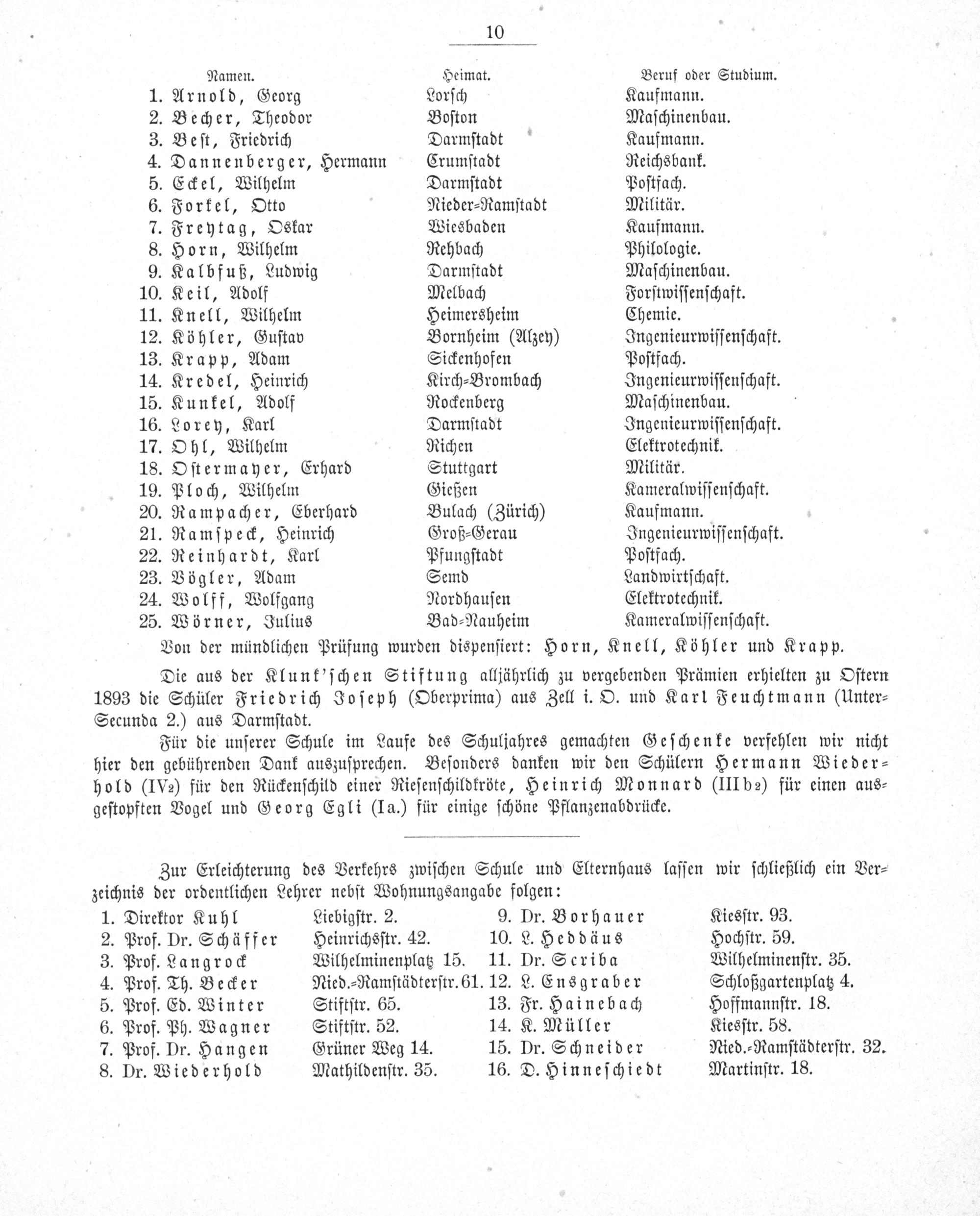 Namen. Heimat. 1. Arnold, Georg Lorſch 2. Becher, Theodor Boſton 3. Beſt, Friedrich Darmſtadt 4. Dannenberger, Hermann Crumſtadt 5. Eckel, Wilhelm Darmſtadt 6. Forkel, Otto Nieder⸗Ramſtadt 7. Freytag, Oskar Wiesbaden 8. Horn, Wilhelm Rehbach 9. Kalbfuß, Ludwig Darmſtadt 10. Keil, Adolf Melbach 11. Knell, Wilhelm Heimersheim 12. Köhler, Guſtav Bornheim(Alzey) 13. Krapp, Adam Sickenhofen 14. Kredel, Heinrich Kirch⸗Brombach 15. Kunkel, Adolf Rockenberg 16. Lorey, Karl Darmſtadt 17. Ohl, Wilhelm Richen 18. Oſtermayer, Erhard Stuttgart 19. Ploch, Wilhelm Gießen 20. Rampacher, Eberhard Bulach(Zürich) 21. Ramſpeck, Heinrich Groß⸗Gerau 22. Reinhardt, Karl Pfungſtadt 23. Vögler, Adam Semd 24. Wolff, Wolfgang Nordhauſen 25. Wörner, Julius Bad⸗Nauheim