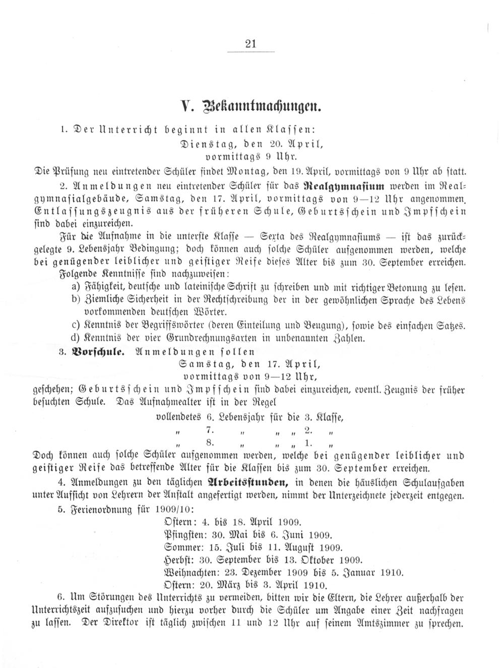 5. Ferienordnung für 1909/10: Oſtern: 4. bis 18. April 1909. Pfingſten: 30. Mai bis 6. Juni 1909. Sommer: 15. Juli bis 11. Auguſt 1909. Herbſt: 30. September bis 13. Oktober 1909. Weihnachten: 23. Dezember 1909 bis 5. Januar 1910. Oſtern: 20. März bis 3. April 1910. 6. Um Störungen des Unterrichts zu vermeiden, bitten wir die Eltern, die Lehrer außerhalb der Unterrichtszeit aufzuſuchen und hierzu vorher durch die Schüler um Angabe einer Zeit nachfragen zu laſſen. Der Direktor iſt täglich zwiſchen 11 und 12 Uhr auf ſeinem Amtszimmer zu ſprechen.
