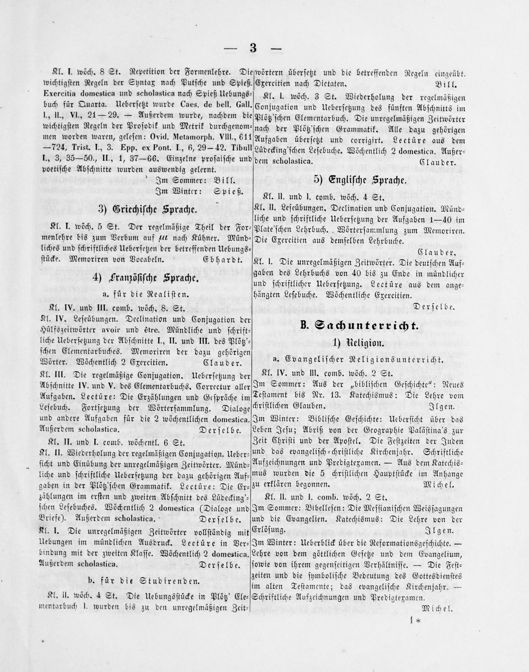 wörtern überſetzt und die betreffenden Regeln eingeübt. Exereitien nach Dietaten. Bill. Kl. l. wöch. 3 St. Wiederholung der regelmäßigen Conjugation und Ueberſetzung des fünften Abſchnitts im Plötz'ſchen Elementarbuch. Die unregelmäßigen Zeitwörter nach der Plötz'ſchen Grammatik. Alle dazu gehörigen Aufgaben überſetzt und corrigirt. Leetüre aus dem Lüdecking'ſchen Leſebuche. Wöchentlich 2 domestica. Außer⸗ dem scholastica. Clauder.