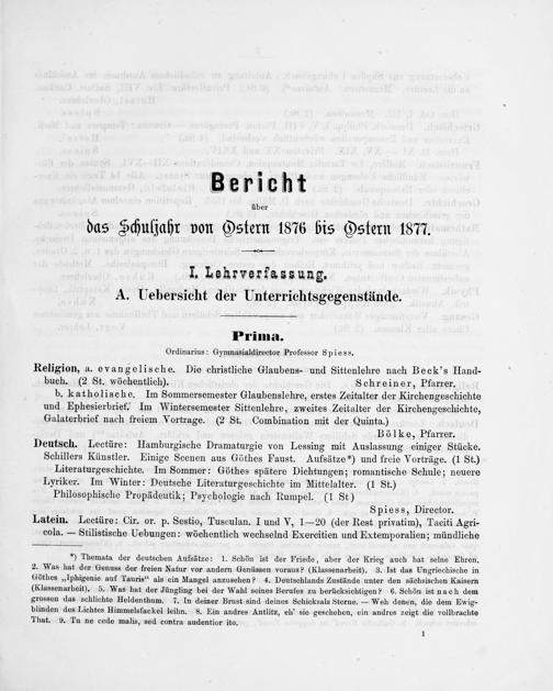 Bölke, Pfarrer. Deutsch. Lectüre: Hamburgische Dramaturgie von Lessing mit Auslassung einiger Stücke. Schillers Künstler. Einige Scenen aus Göthes Faust. Aufsätze*) und freie Vorträge.(1 St.)