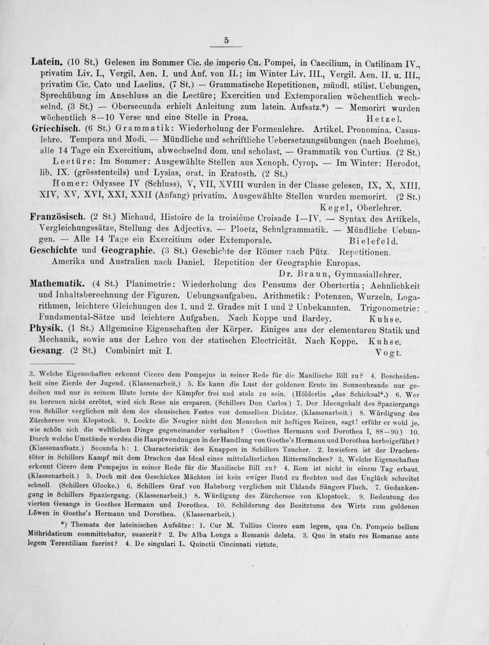 Latein.(10 St.) Gelesen im Sommer Cic. de imperio Cn. Pompei, in Caecilium, in Catilinam IV., privatim Liv. I., Vergil. Aen. I. und Anf. von II.; im Winter Liv. III., Vergil. Aen. II. u. III., privatim Cic. Cato und Laelius.(7 St.)— Grammatische Repetitionen, münqdl. stilist. Uebungen, Sprechübung im Anschluss an die Lectüre; Exercitien und Extemporalien wöchentlich wech- selnd.(3 St.)— Obersecunda erhielt Anleitung zum latein. Aufsatz.*)— Memorirt wurden wöchentlich 8— 10 Verse und eine Stelle in Prosa. Hetzel.