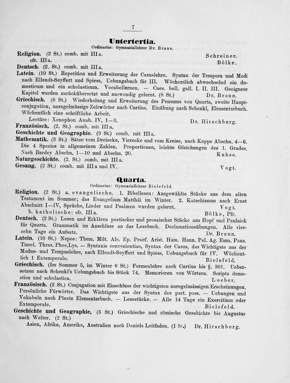 Deutsch.(2 St.) Lesen und Erklären poetischer und prosaischer Stücke aus Hopf und Paulsiek für Quarta. Grammatik im Anschluss an das Lesebuch. Declamationsübungen. Alle vier- zehn Tage ein Aufsatz. Dr. Braun.