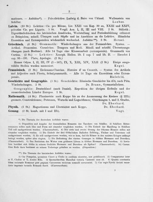 Latein.(10 St.) Lektüre: Cic. pro Milone, Liv. XXII von Kap. 30 an, XXIII und XXIV, privatim Cic. pro Ligario. 5 St. Vergil. Aen. 1, II, III und VIII. 2 St. Stilistik; Eigentümlichkeiten des lateinischen Ausdrucks, Wortstellung und Periodenbildung erläutert an Beispielen; mündl. Ubungen nach Süpfle und im Anschluss an die Lektüre. Häusliche Exercitien und Extemporalien wöchentlich wechselnd. Aufsätze**). 3 St. Hetzel.