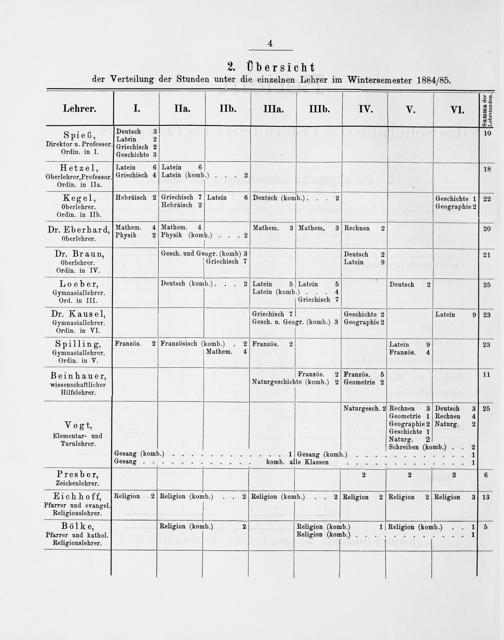 2. UÜbersicht der Verteilung der Stunden unter die einzelnen Lehrer im Wintersemester 1884/85.