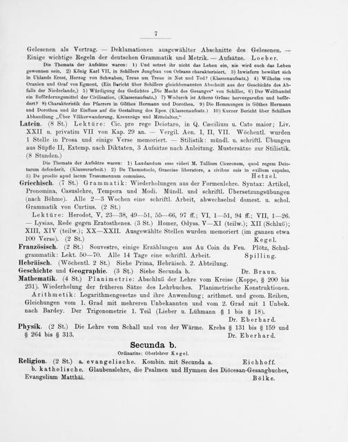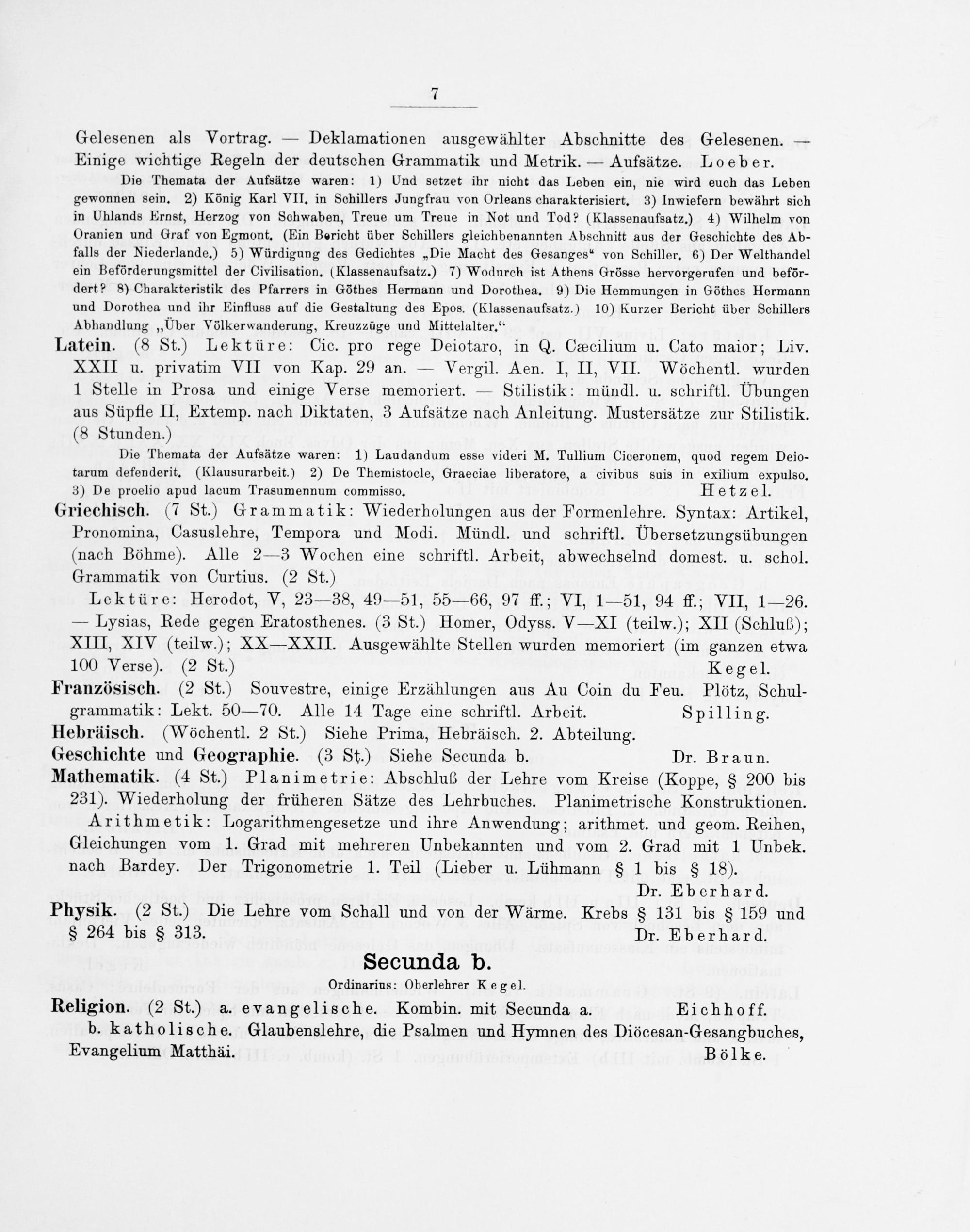 § 264 bis§ 313. Dr. Eberhard. Secunda b. Ordinarius: Oberlehrer Kegel. Religion.(2 St.) a. evangelische. Kombin. mit Secunda a. Eichhoff.
