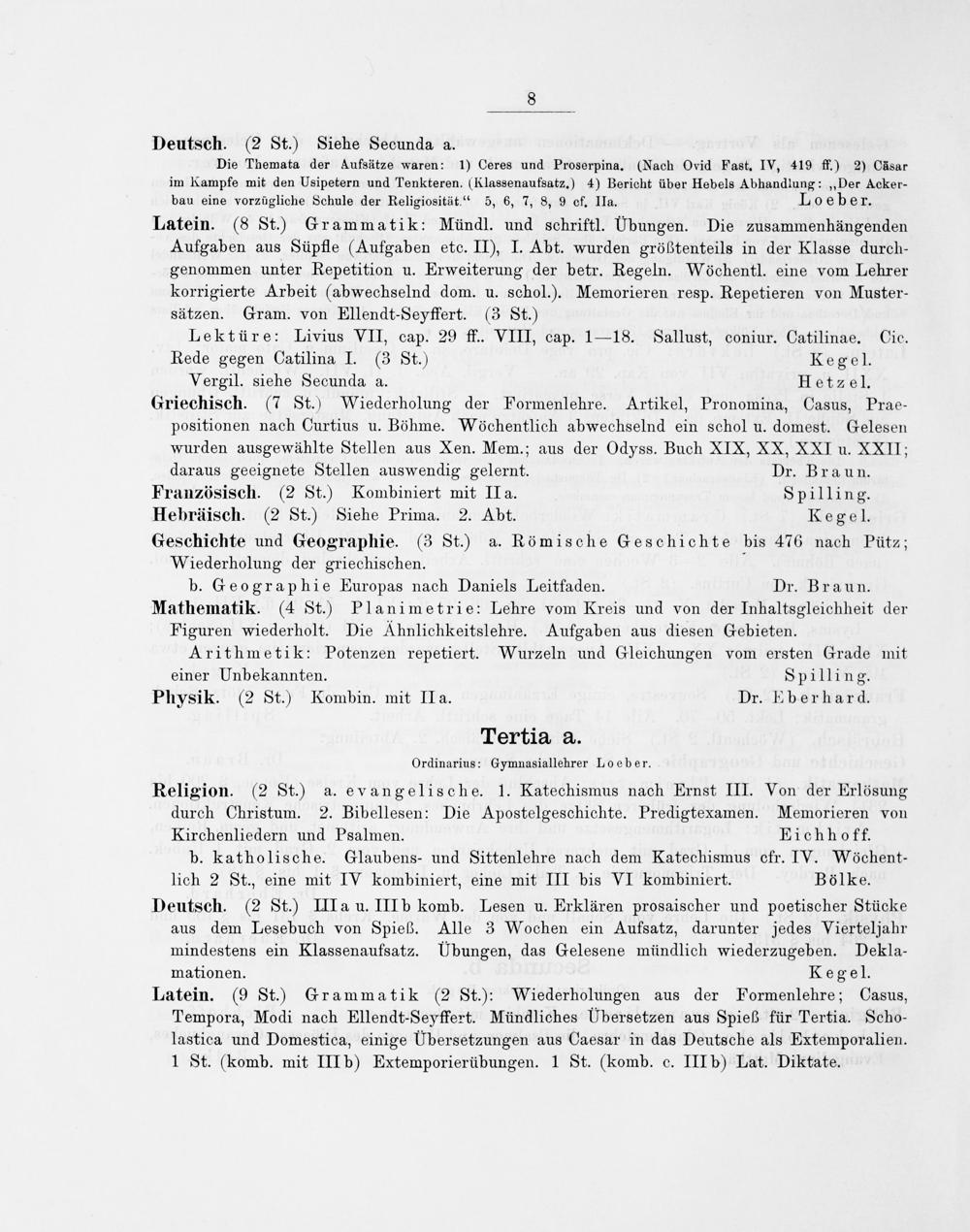 Latein.(8 St.) Grammatik: Mündl. und schriftl. Ubungen. Die zusammenhängenden Aufgaben aus Süpfle(Aufgaben etc. II), I. Abt. wurden größtenteils in der Klasse durch- genommen unter Repetition u. Erweiterung der betr. Regeln. Wöchentl. eine vom Lehrer korrigierte Arbeit(abwechselnd dom. u. schol.). Memorieren resp. Repetieren von Muster- sätzen. Gram. von Ellendt-Seyffert.(3 St.)