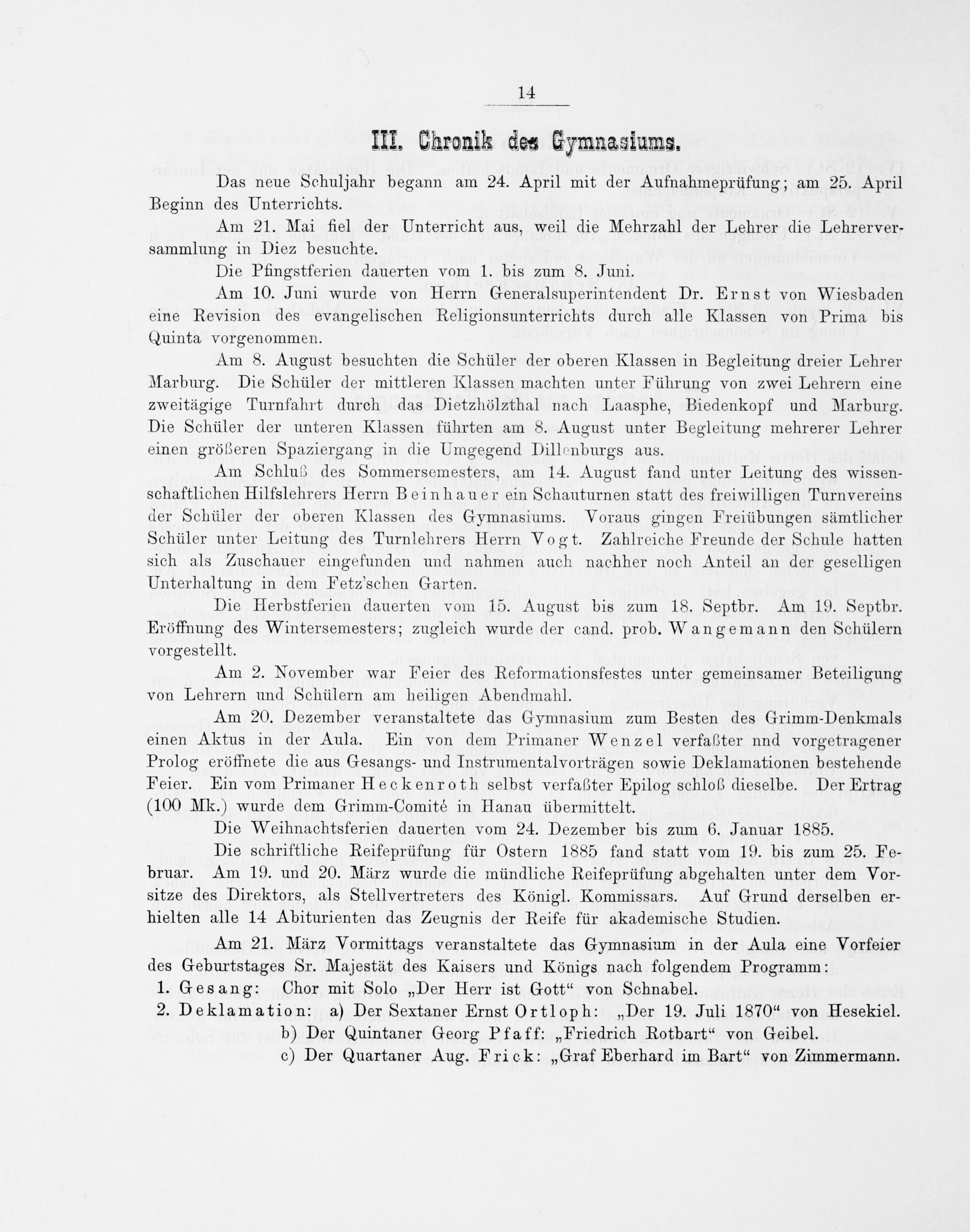 Am 21. März Vormittags veranstaltete das Gymnasium in der Aula eine Vorfeier des Geburtstages Sr. Majestät des Kaisers und Königs nach folgendem Programm: 1. Gesang: Chor mit Solo„Der Herr ist Gott“ von Schnabel. 2. Deklamation: a) Der Sextaner Ernst Ortloph:„Der 19. Juli 1870“ von Hesekiel. b) Der Quintaner Georg Pfaff:„Friedrich Rotbart“ von Geibel. c) Der Quartaner Aug. Frick:„Graf Eberhard im Bart“ von Zimmermann.