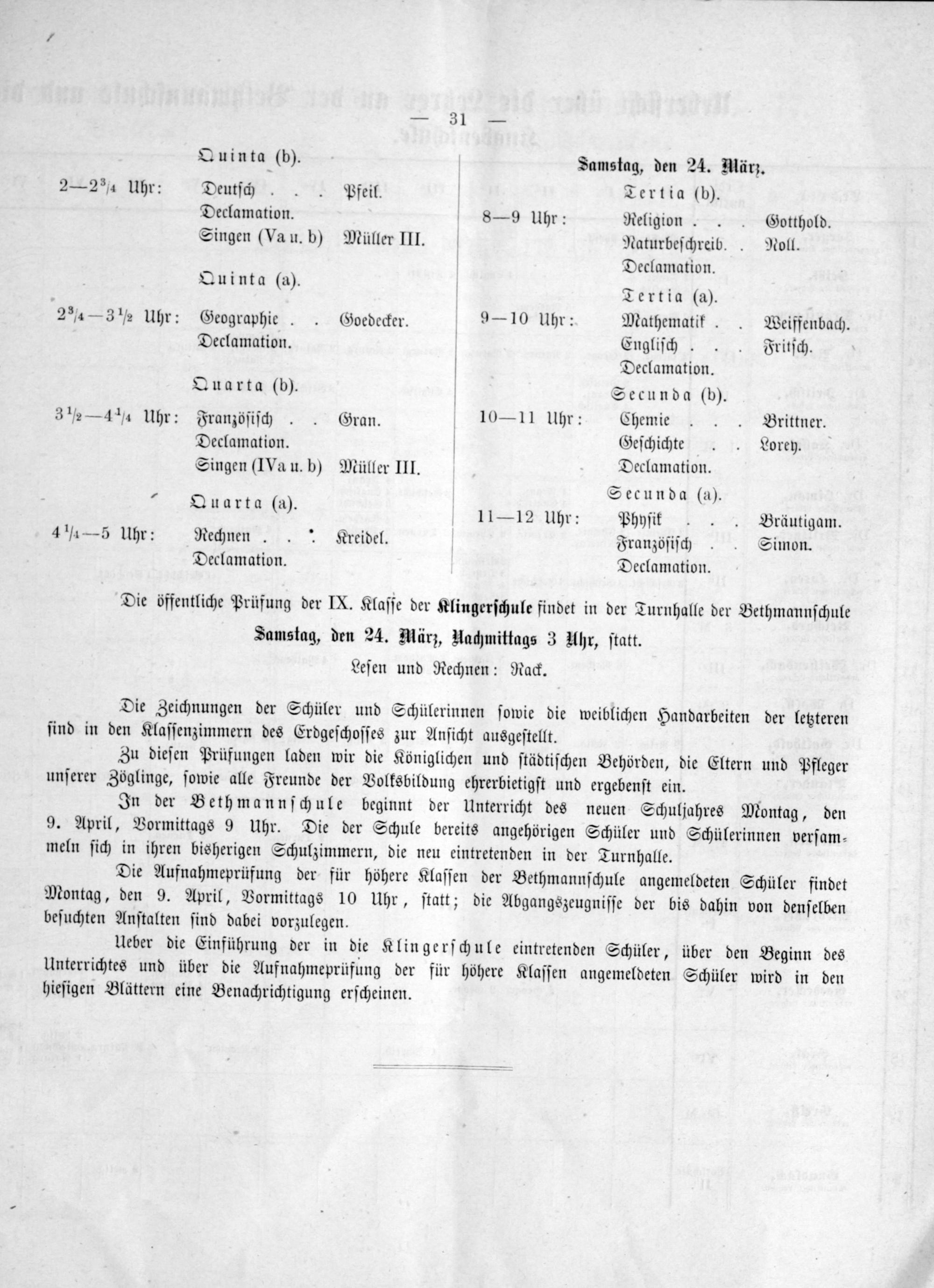 Quinta(b). Samstag, den 24. März. 2— 2 3¾ Uhr: Deutſch. Pfeil. Tertia(b). Declamation. 8—9 Uhr: Religion.. Gotthold. Singen(Va u. b) Müller II. Naturbeſchreib.. Noll. Declamation.