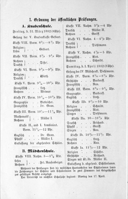 V Deutſch. Müller II. Rechnen. Greiff. Klaſſe VI. Nachm. 4— 4 ½ Uhr. Deut: deufſch..Diehlmann. Klaſſe V. Nachm. 4 ½— 5 Uhr. Franzöſiſch.. Ries. Rechnen. Schmidt. Samstag, d. 1. April 1882(SUhr). Geſang der IV. Mädchenkl. Diehlmann. Klaſſe IV. Vorm. 8 ¼— 8 ¾ Uhr. Geſchichte. Bardorff. Franzöſiſch.. Nau. Klaſſe III. Vorm. 8 ྗ 9 ¼ Uhr. Geographie.. Bardorff. Engliſch. Lentz.