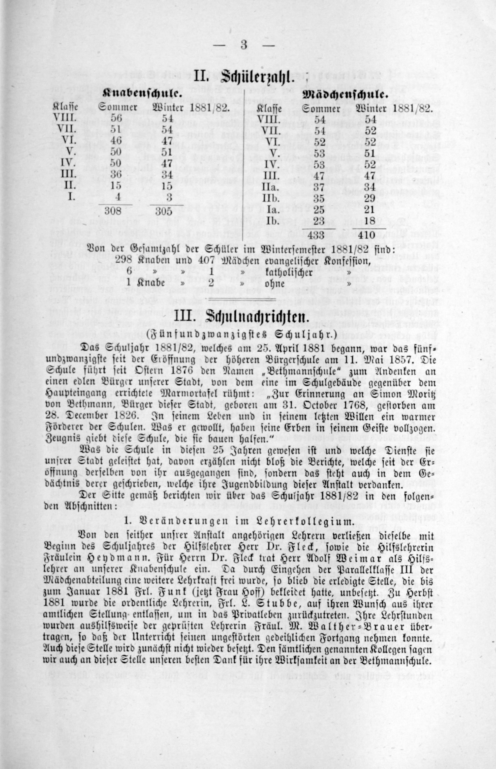 Von den ſeither unſrer Anſtalt angehörigen Lehrern verließen dieſelbe mit Beginn des Schuljahres der Hilfslehrer Herr Dr. Fleck, ſowie die Hilfslehrerin Fräulein Heydmann. Für Herrn Dr. Fleck trat Herr Adolf Weimar als Hilfs⸗ lehrer an unſerer Knabenſchule ein. Da durch Eingehen der Parallelklaſſe III der Mädchenabteilung eine weitere Lehrkraft frei wurde, ſo blieb die erledigte Stelle, die bis zum Januar 1881 Frl. Funk(ietzt Frau Hoff) bekleidet hatte, unbeſetzt. Zu Herbſt 1881 wurde die ordentliche Lehrerin, Frl. L. Stubbe, auf ihren Wunſch aus ihrer amtlichen Stellung entlaſſen, um in das Privatleben zurückzutreten. Ihre Lehrſtunden wurden aushilfsweiſe der geprüften Lehrerin Fräul. M. Walther⸗Brauer über⸗ tragen, ſo daß der Unterricht ſeinen ungeſtörten gedeihlichen Fortgang nehmen konnte. Auch dieſe Stelle wird zunächſt nicht wieder beſetzt. Den ſämtlichen genannten Kollegen ſagen wir auch an dieſer Stelle unſeren beſten Dank für ihre Wirkſamkeit an der Bethmannſchule.