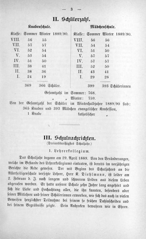 Das Schuljahr begann am 29. April 1889. Von den Veränderungen, welche im Beſtande des Lehrerkollegiums eintraten, iſt bereits im vorjährigen Berichte die Rede geweſen. Der mit Beginn des Schuljahres an die Allerheiligenſchule verſetzte Lehrer, Herr K. Diehlmann, iſt leider am 2. Februar d. J. nach langem und ſchwerem Leiden aus dieſem Leben abgeruſen worden. Er hatte unſerer Schule zehn Jahre lang angehört und ſich die Liebe und Hochachtung aller, die ihn kannten, beſonders aber ſeiner Mitlehrer und ſeiner Schülerinnen erworben, wie ſich das auch in vielen Beweiſen herzlichſter Teilnahme bei ſeinem ſo frühen Dahinſcheiden und bei ſeinem Begräbniſſe zeigte. Sein Andenken bewahren wir in Ehren.
