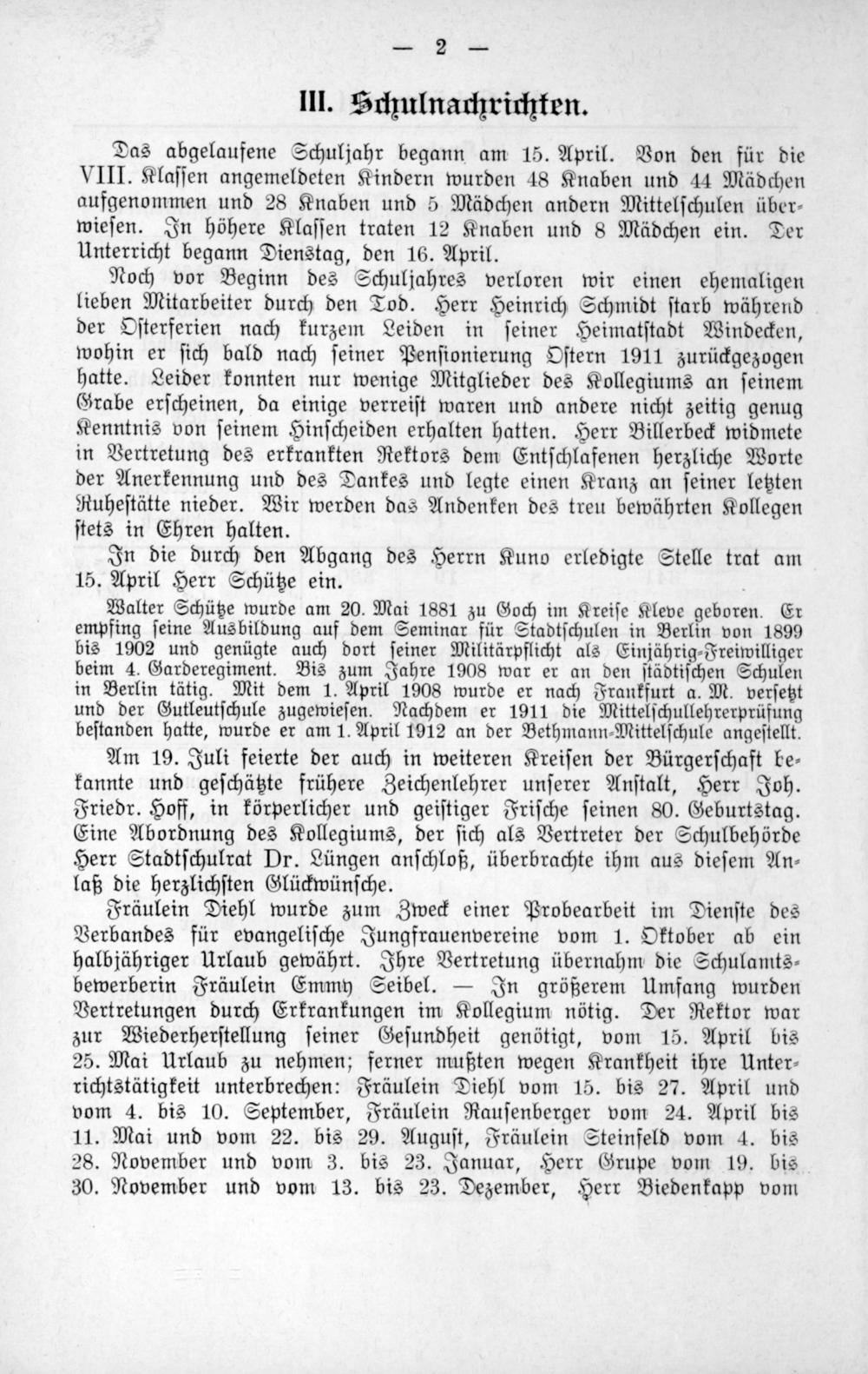 Noch vor Beginn des Schuljahres verloren wir einen ehemaligen lieben Mitarbeiter durch den Tod. Herr Heinrich Schmidt ſtarb während der Oſterferien nach kurzem Leiden in ſeiner Heimatſtadt Windecken, wohin er ſich bald nach ſeiner Penſionierung Oſtern 1911 zurückgezogen hatte. Leider konnten nur wenige Mitglieder des Kollegiums an ſeinem Grabe erſcheinen, da einige verreiſt waren und andere nicht zeitig genug Kenntnis von ſeinem Hinſcheiden erhalten hatten. Herr Billerbeck widmete in Vertretung des erkrankten Rektors dem Entſchlafenen herzliche Worte der Anerkennung und des Dankes und legte einen Kranz an ſeiner letzten Ruheſtätte nieder. Wir werden das Andenken des treu bewährten Kollegen ſtets in Ehren halten.