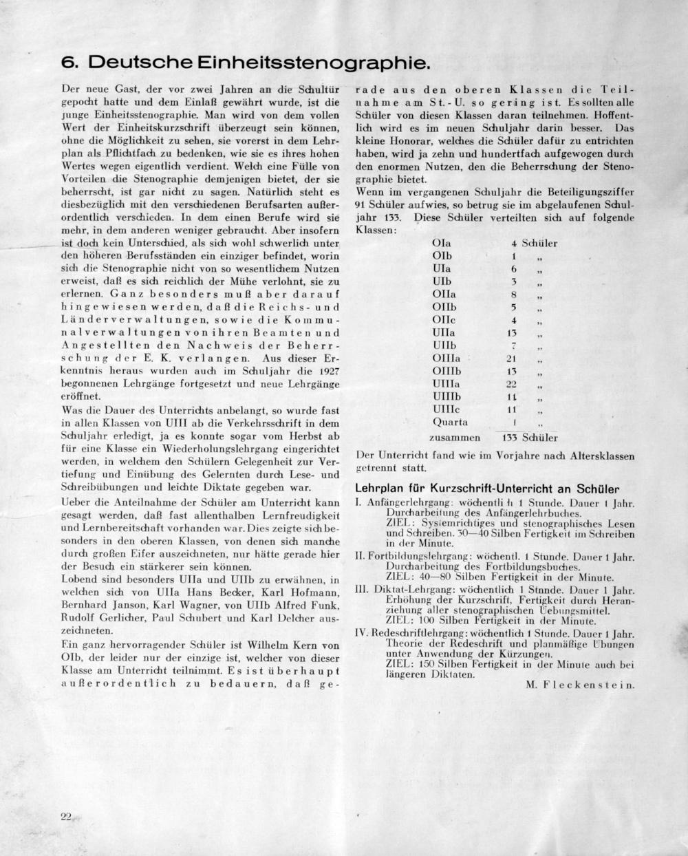 Was die Dauer des Unterrichts anbelangt, so wurde fast in allen Klassen von UIII ab die Verkehrsschrift in dem Schuljahr erledigt, ja es konnte sogar vom Herbst ab für eine Klasse ein Wiederholungslehrgang eingerichtet werden, in welchem den Schülern Gelegenheit zur Ver- tiefung und Einübung des Gelernten durch Lese- und Schreibübungen und leichte Diktate gegeben war.