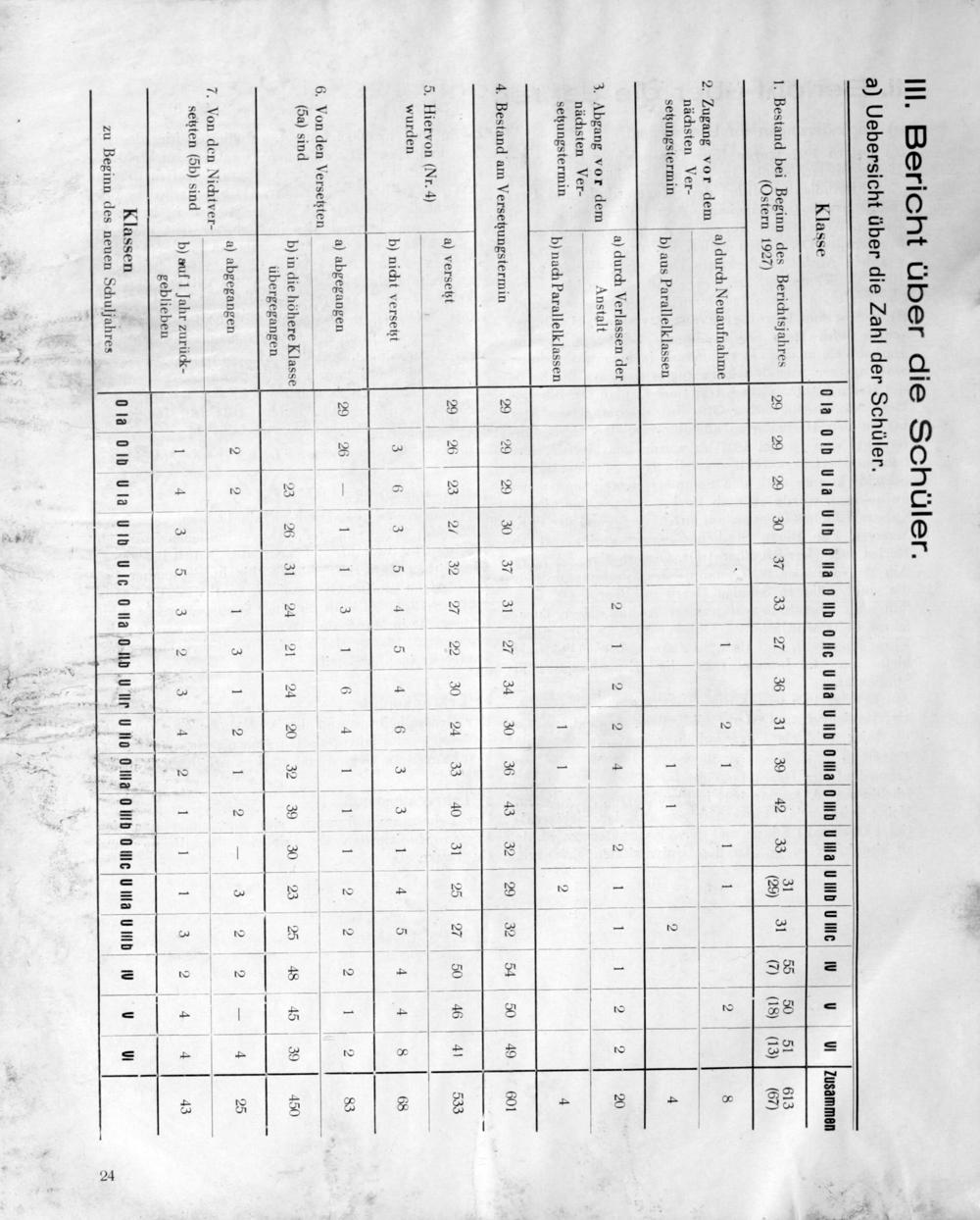 a) Uebersicht über die Zahl der Schüler.. Klasse 0la OIb U laà UIb 0 la 9 Ib O le D1c* 1w mla OHb Ua Un e döe ſusammen- w ſ ſ ſ ſ ſ 1. Bestand bei Beginn des Berichtsjahres 29 29 29 30 37 33 2 31 31 55 50 51 61¹3 (Ostern 1927) 9 29 2— 25 V 39 42 33(—G) 3¹1() ds 3)] G) ——— —— V— a) durch Neuaufnahme 1 2 1 1 1 2 8 2. Zugang vor dem V V V nächsten Ver-——— 3 85 ſ †— setzungstermin b) aus Parallelklassen 1 1 V 2 4 — a) durch Verlassen der 2 1 2 2 V 4 2 1 1 1[2 V 2 20 3. Abgang vor dem Anstalt b V nächsten Ver-———————— 3— 5 5 setzungstermin b) nach Parallelklassen V 1 1 2 4 — ſ ſ 4. Bestand am Versetzungstermin 29 29 V 29 30 37 31 27 34 30 36 43 32 29 32 54 50 49 601 1.... vſͤͤ 5 a) versetzt 29 26 23 27/ 32 27 22 30 24 33 40 31 25 27 50 46 41 533 5. Hiervon(Nr. 4) 1————b wurden b) nicht versetzt 3 6 3 5 4 5 4 6 3 3. 1 4 5 4 4 8 68 a) abgegangen 25 26 1 1 3 1 64 12 2 2 12 83 6. Von den Versetzten 1.— 3——— (Sa) sind b) in die höhere Klasse 33 265 31 24 21 24 20 32 39 30 23 25 48 45 30 450 übergegangen .. ub a) abgegangen 2 2 1 3 1 2 1 2— 3 2 2— 4 25 7. Von den Nichtver- 2 1—————— setzten S5b) sind„ b) aufl Jahr zurüde- 1 4 3 5 3 2 3 4 2 1 1 3 2 4 4 43 geblieben 1 ſ ſ 1 ſ ſ V . ꝛblassen 0la Dn e i ie dhe dn u e uhe dma Pmb PHc uHa ud ue d zu Beginn des neuen Schuljahres . 3