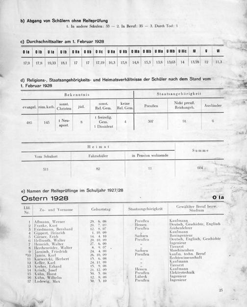 nld. Zu- und Vorname Geburtstag Staatsangehörigkeit V Sruclium 1 1[Amann, Werner 29. 6. 08 Preußten Kaufmann 2 Franke, Kurt 20. 7. 09 Hessen Deutsch, Geschichte, Englisch 3 Friedmann, Bernhard 12. 8. 07 Preußen Zeichenlehrer 4 Gippert, Peinrich 1. 10. 00„ Kaufmann 5 Cörner, Erich 14. 4. 10 Sachsen Bauingenieur 6 Ilellmuth. Walter 20. 10. 00 Preußen Deutsch, Englisch, Geschichte 7 Hemrich, Walter 27. 6. 09, Ingenieur 8 Herchenröder, Walter 8. 9. 07.„ Tierarzt 9 jaenisch, Friedrich 24. 4. 08 Sachsen Maschinenbau *1O jamin, Karl 26. 10. 00 Preufien kaufm. techn. Beruf.