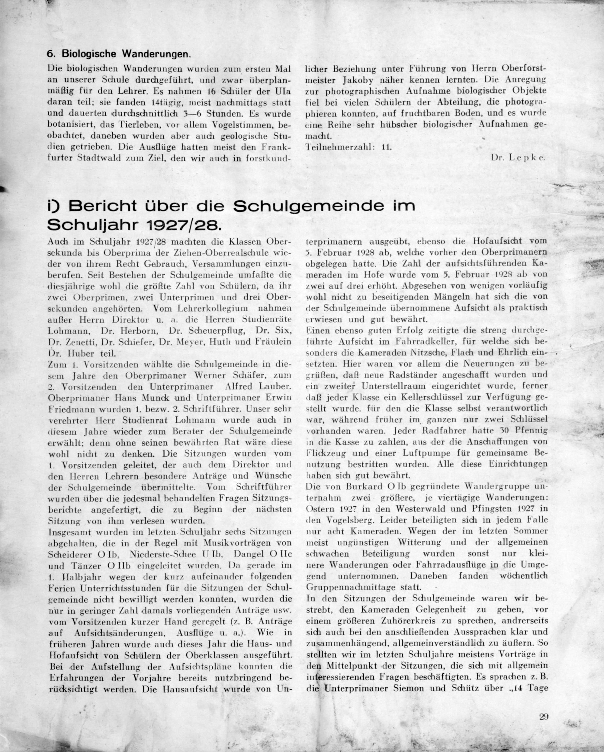 Insgesamt wurden im letzten Schuljahr sechs Sitzungen abgehalten, die in der Regel mit Musikvorträgen von Scheiderer O Ib. Niederste-Schee UIb. Dangel O IIc und Tänzer OIIb eingeleitet wurden. Da gerade im 1. Halbjahr wegen der kurz aufeinander folgenden Ferien Unterrichtsstunden für die Sitzungen der Schul- gemeinde nicht bewilligt werden konnten, wurden die nur in geringer Zahl damals vorliegenden Anträge usw. vom Vorsitzenden kurzer Hand geregelt(7. B. Anträge auf Aufsichtsänderungen, Ausflüge u. a.). Wie in früheren Jahren wurde auch dieses Jahr die Haus- und Hofaufsicht von Schülern der Oberklassen ausgeführt. Bei der Aufstellung der Aufsichtspläne konnten die Erfahrungen der Vorjahre bereits nutzbringend be- rücksichtigt werden. Die Hausaufsicht wurde von Un-