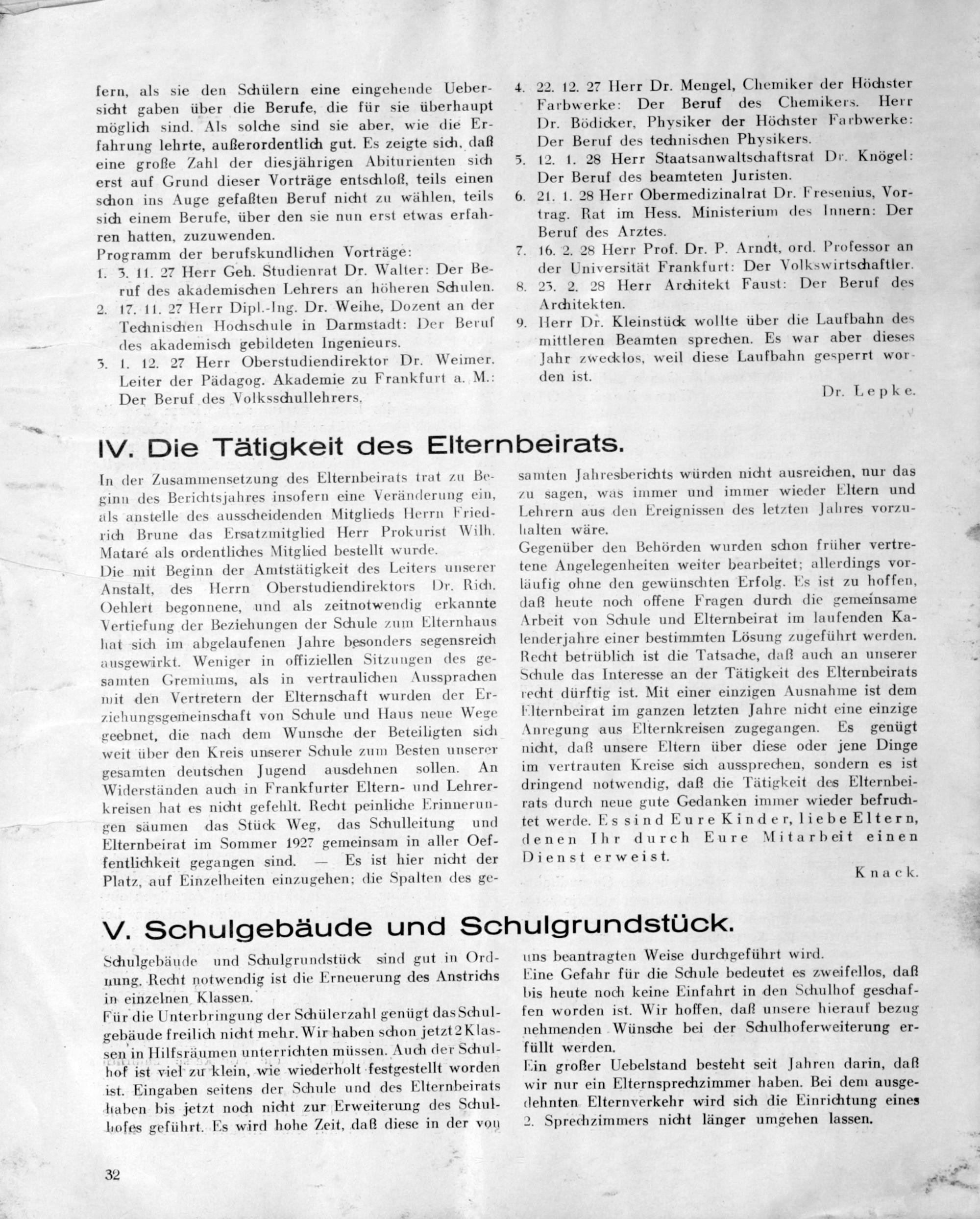 4. 22. 12. 27 Herr Dr. Mengel, Chemiker der Höchster Farbwerke: Der Beruf des Chemikers. Herr Dr. Bödicker, Physiker der Höchster Farbwerke: Der Beruf des technischen Physikers.