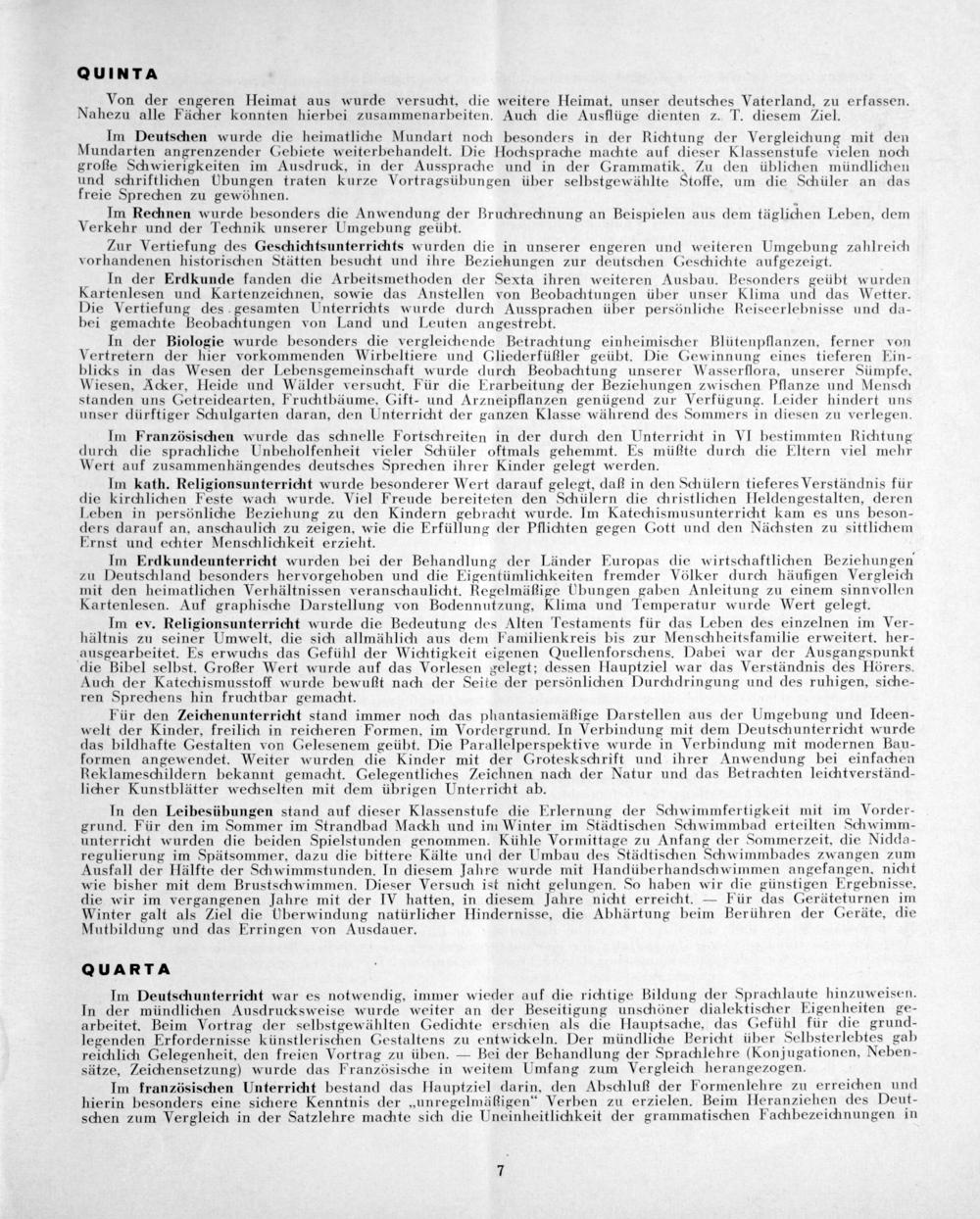 In der Erdkunde fanden die Arbeitsmethoden der Sexta ihren weiteren Ausbau. Besonders geübt wurden Kartenlesen und Kartenzeichnen, sowie das Anstellen von Beobachtungen über unser Klima und das Wetter. Die Vertiefung des gesamten Unterrichts wurde durch Aussprachen über persönliche Reiseerlebnisse und da- bei gemachte Beobachtungen von Land und Leuten angestrebt.