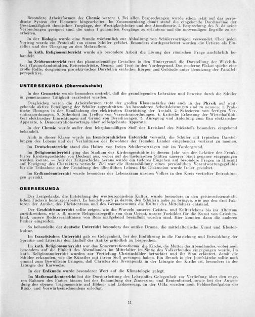 Im kath. Religionsunterricht war das Konzentrationsthema: die Kirche, die Mutter des Abendlandes, wobei noch besonders auf die Einheit des Abendlandes im Mittelalter im Sinne des Völkerbundes eingegangen wurde. Im kath. Religionsunterricht wurden zur Vertiefung Christusbilder betrachtet und ihr Sinn erläutert, damit die Schüler erkannten, wie die Künstler mit ihrem Stoff gerungen haben. Ein Besuch in der Josefskirche sollte noch einmal zum Bewuftsein bringen, daf Christus der Brennpunkt in der Liturgie der Kirche ist, besonders in der Liturgie der Karwoche.