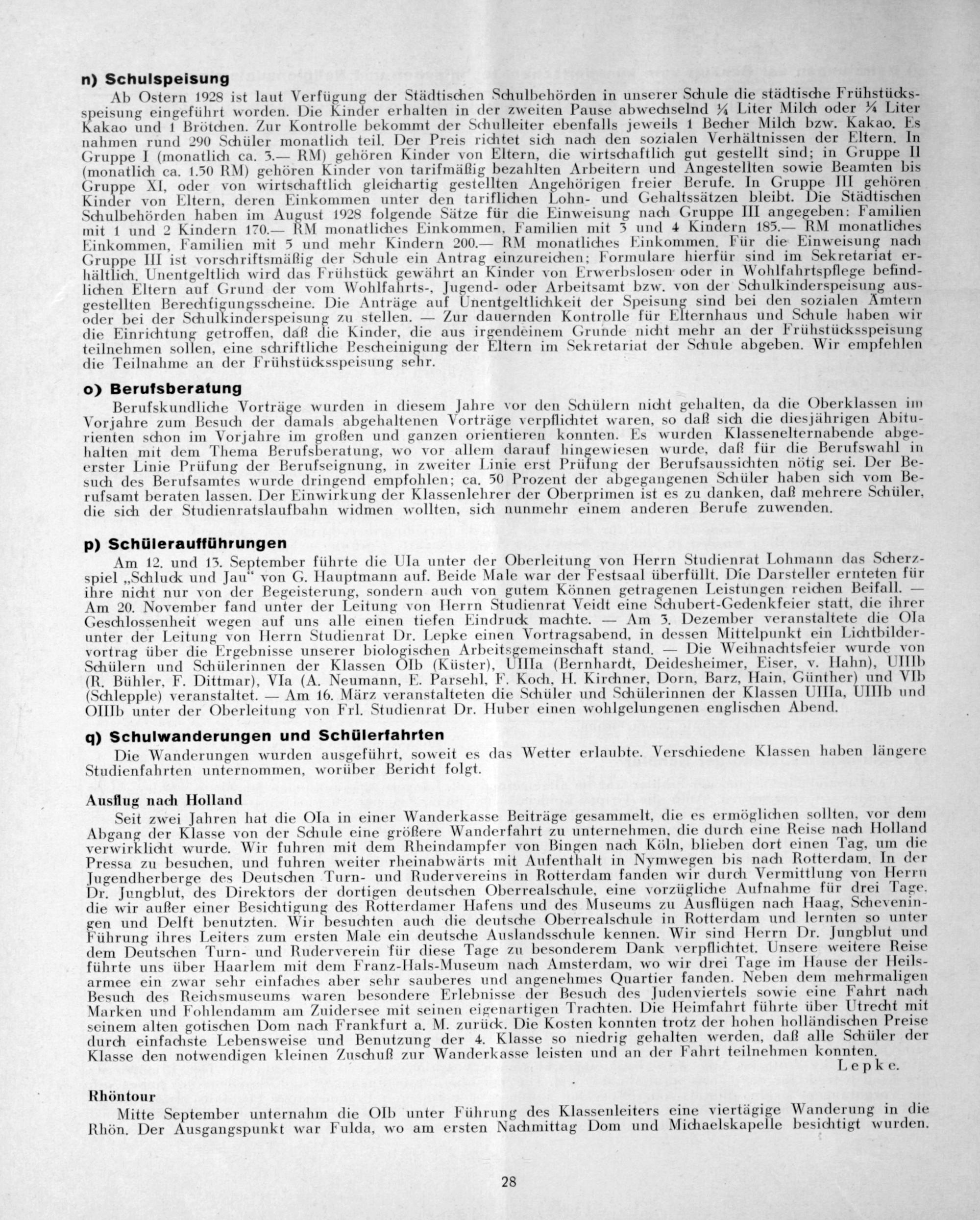 Seit zwei Jahren hat die Ola in einer Wanderkasse Beiträge gesammelt, die es ermöglichen sollten, vor dem Abgang der Klasse von der Schule eine gröftere Wanderfahrt zu unternehmen, die durch eine Reise nach Holland verwirklicht wurde. Wir fuhren mit dem Rheindampfer von Bingen nach Köln, blieben dort einen Tag, um die Pressa zu besuchen, und fuhren weiter rheinabwärts mit Aufenthalt in Nymwegen bis nach Rotterdam. In der jugendherberge des Deutschen Turn- und Rudervereins in Rotterdam fanden wir durch Vermittlung von Herrn Dr. Jungblut, des Direktors der dortigen deutschen Oberrealschule, eine vorzügliche Aufnahme für drei Tage. die wir außer einer Besichtigung des Rotterdamer Hafens und des Museums zu Ausflügen nach Haag, Schevenin- gen und Delft benutzten. Wir besuchten auch die deutsche Oberrealschule in Rotterdam und lernten so unter Führung ihres Leiters zum ersten Male ein deutsche Auslandsschule kennen, Wir sind Herrn Dr. Jungblut und dem Déeutschen Turn- und Ruderverein für diese Tage zu besonderem Dank verpflichtet. Unsere weitere Reise führte uns über Haarlem mit dem Franz-Ilals-Museum nach Amsterdam, wo wir drei Tage im Hause der Heils- armee ein zwar sehr einfaches aber sehr sauberes und angenehmes Quartier fanden. Neben dem mehrmaligen Besuch des Reichsmuseums waren besondere Erlebnisse der Besuch des Judenviertels sowie eine Fahrt nach Marken und Fohlendamm am Zuidersee mit seinen eigenartigen Trachten. Die Heimfahrt führte über Utrecht mit seinem alten gotischen Dom nach Frankfurt a. M. zurüdk. Die Kosten konnten trotz der hohen holländischen Preise durch einfachste Lebensweise und Benutzung der 4. Klasse so niedrig gehalten werden, daft alle Schüler der Klasse den notwendigen kleinen Zuschuß zur Wanderkasse leisten und an der Fahrt teilnehmen konnten⸗