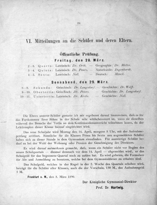 Frankfurt a. M., den 8. März 1890. Der Königliche Gymnasial-Direktor