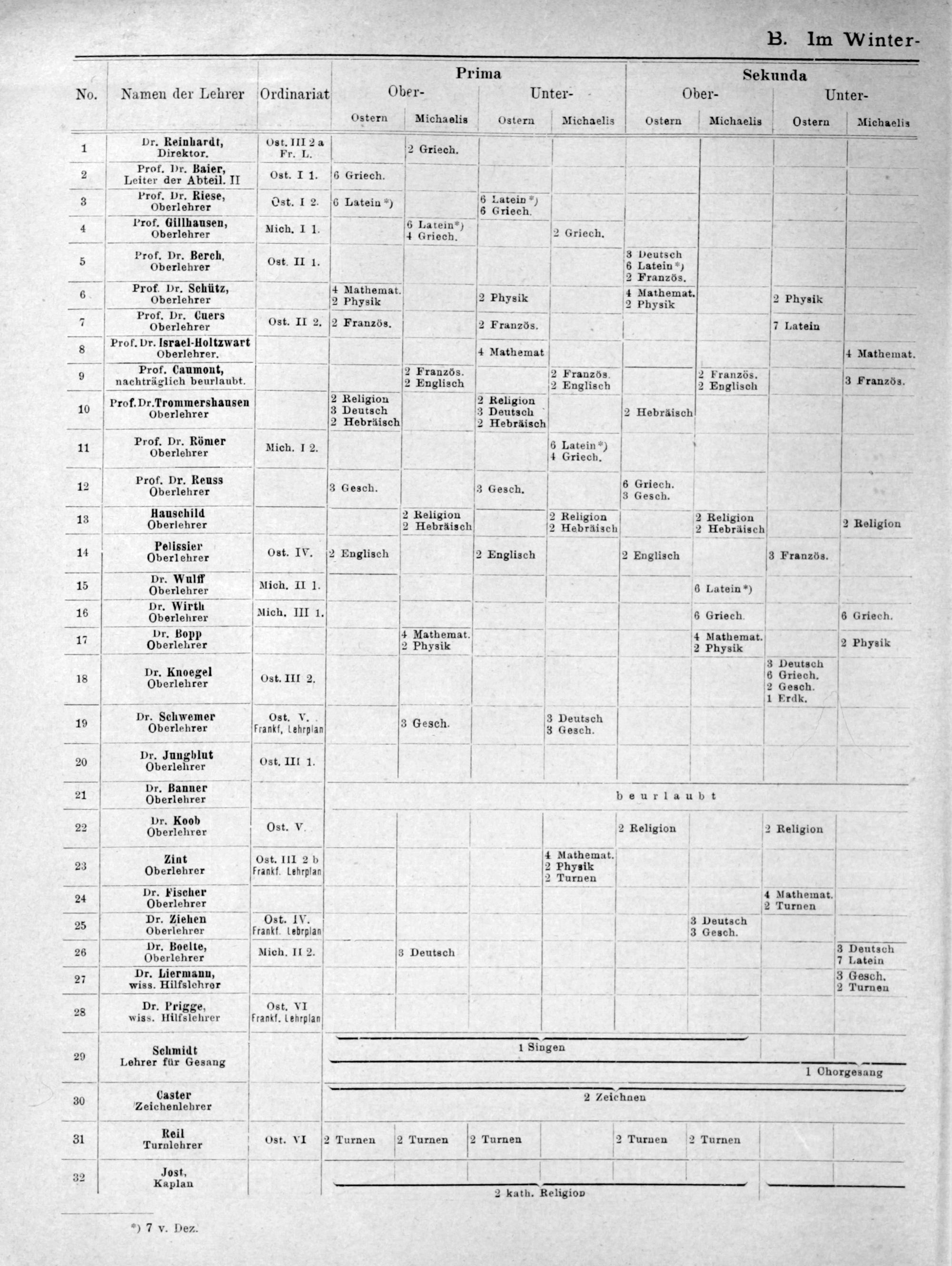 No. 1 Pr. Reinhardt, Direktor. 2 Prof. Dr. Baier, — keiter aer Abteil. I 3 Prof. Dr. Riese, Oberlehrer 4 Prof. Gillhausen, oberlehrer 5 prof. Dr. Berch, Oberlehrer 3. Prof Dr. Schütz, Oberlehrer , Prof. Dr. Guers 4 Oberlehrer Prof. Dr. Israel-Holtzwart Oberlehrer. o prof.(aumont, — nachträglich beurlaubt. 10 Prof. Dr. Trommershausen Oberlehrer 11 Prof. Dr. Römer Oberlehrer — 3——— 12 Prof. Dr. Reuss 2 Oberlehrer 12 Hauschilld Oberlehrer— 14 Pelissier Oberlehrer 1 Pr. Wuf Oberlehrer 186 Dr. Wirth Oberlehrer . Dr. Bopp 17 Oberlehrer 18 Dr. Knoegel Oberlehrer 19 Dr. Schwemer Oberlehrer Dr. Jungblut 2⁰ Oberlehrer Dr. Banner 21 Oberlehrer 22 Dr. Koob 2 Oberlehrer Aat 23 Oberlehrer 24 Pr. Fischer Oberlehrer 25 Dr. Ziehen Oberlehrer 26 1 Dr. Boelte, Oberlehrer 2 Dr. Liermann, wiss. Hilfslehror. Dr. Prigge 28 wiss. Hilfslehrer —..— 29 Schmidt Lehrer für Gesang Caster 3⁰ V Zeichenlebrer ———— Reil 31 Turnlehrer 32 Jost, * Kaplan