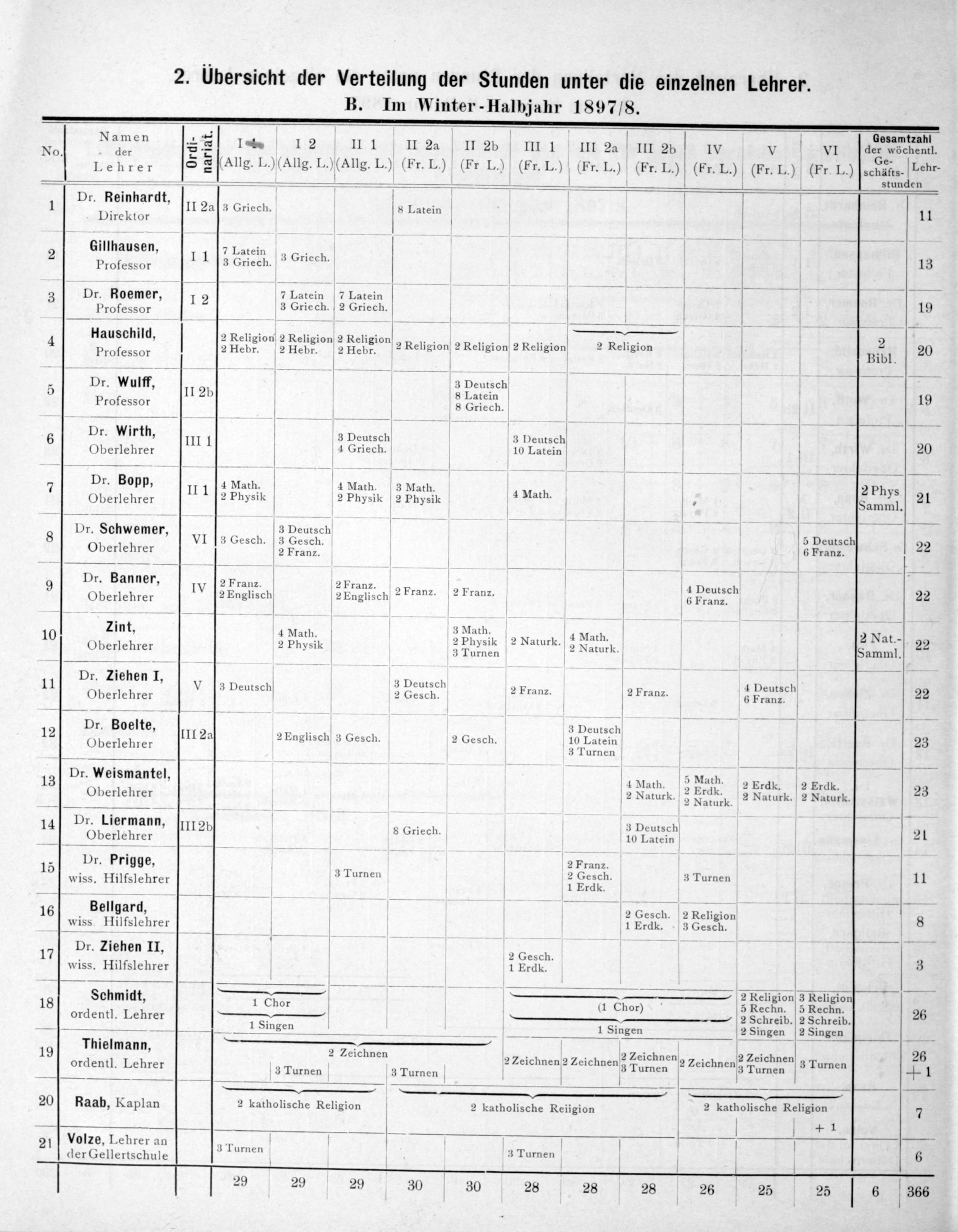 —————ꝛ——˖BQęOQꝑ—Q—CQ—Q.—Q.—C—Q—Q—Q—Qę—ęQ——— Namen 2—.. 4 Srberenn N* 4 S½. 14 1.2 11 1 II 2a II 2 b III 1 III 2a III 2 b V V VI ler wöchent 0. er 4 21 4— 2 Lehrer ſS ZAng. L.)(Allg. L.)(Allg. L.)(Fr. L.)(Fr L.)(Fr. L.)(Fr. L.) Er I.)( der e1.)(Fr. L.)(Fr L.) ſcbants. Lehr —— A—— 1— ¹ 1—— stunden ——————— f rdt, 1 Reinhar II 2a3 Griech. 8 Latein 11 Direktor ———— 2 Gillhausen, 11 7 Lateln 3 Griech. 13 Professor 3 Griech. 1 3 Dr. Roemer 5 7 Latein/ Latein 3 Professor 12² 3 Griech. 2 Griech. V 19 — 4—— 2———— Hauschild, 2 Religion 2 Religion 2 Reli b0n d2 2 4 2 Hebr iei Sion Religi gion 2 Religion 2 Religion 2 Religion 20 5 2 Hebr. 2 Hebr. 2 Hebr. Bibl Proſessor 1 8. LEeu ———*— ,———+ 8 W ff. 3 Deutsch 5 uf II 2 b 8 Latein 19 h. du 8 Griech. —— 8— õ 6 Dr. Wirth, III 1 3 Deutsch 3 Deutsch 20 Oberlehrer 4 Griech. 10 Latein — 5————— . B0pp. 4 Math. 1 Math. 3 Math 2 Phys 7 Dhr. Konn, 111 2 Physik 2 Physik 2 Physik 4 Math. V V Samml 21 — 4——— 8 Pr. Schwemer, VI s Gesch 3 Deueach 5 Deutsch 22 Oberlehrer Peesen: esoh⸗ 6 Franz. 2 Franz. 4 . Banner, 2 F 2 Fra 3 ranz. 2 Franz.„ 4 Deutsch 22 9 he Fanner IV 2 Englisch 2 Englisch 2 Franz. 2 Franz. 6 Franz. 22 ———.— 2int, 4 Matl 3 Math. 4 Matl 2 Nat.- c 10 4 Math. 2 Physik 2 Naturk. 4 Math. 2 j9 22 Oberlehrer 2 Physik 5 Tnene 2 Naturk. Samml. Zienhen 1 3 Deutsch 4 Deutsch 11 V ſs Deutsch 3 Deutsch 2 Franz. 2 Franz. 4 Deutsch 22 Pr. rhen 2 Gesch. n an 6 Franz. Dr. Boelte 3 Deutsch 12 3 III 2 a 2 Englisch 3 Gesch. 2 Gesch. 10 Latein 23 Oberlehrer 3 Turnen 13 Dr. Weismantel, Math. 5 Math. 2 Prdk. 2 Brdk. 23 Oberlehrer 2 Naturk. 5 Wraheh 2 Naturk. 2 Naturk. Dr. Liermann, 2 3 Deutsch 2 14 Oberlehrer 1Ir2 8 Eriech. 10 Latein 21 Dr. Prigge 2 Franz. 15.. gge, 3 Turnen 2 Gesch. 3 Turnen 11 wiss. Hilfslehrer 1 Erdk. 16 Bellgard, 2 Gesch. 2 Religion 8 W iss Hilfslehrer 1 Erdk. 3 Gesch. 17 Dr. Ziehen II, 2 Gesch 3 wiss. Hilfslehrer 1 Erdk ————.————————— . 2 Religion 3 R Religion 18 Schmidt, 1 Chor(1 Chor) f 5 Rechn. 5 5 Rechn. 26 ordentl. Lehrer ·— 2 Schreib. 2 Schreib. ——— 1 Singen I— 1 Singen ² Singen 2 Singen— Thieimann,— 1 6 19 1 1 2 Zeichnen 2 Zeichnen 2 Zeichnenſs 2 2 Zeichnenſe 2 Zeichnen² 1 Technen 3 Turnen 2 1 ordentl. Lehrer 3 Turnen 3 Turnen 3 20] haab, Kaplan 2 katholische Religion 2 katholische Reiigion 2 katholische Religion 7 2 P T — 1 ehrer?— 21 Volze, Lehrer an 3 urne. der Gellertschule B Turnen 3 Turnen 6 29 29 29 30 30 28 28 28 26 25 22 ſ6 V 366