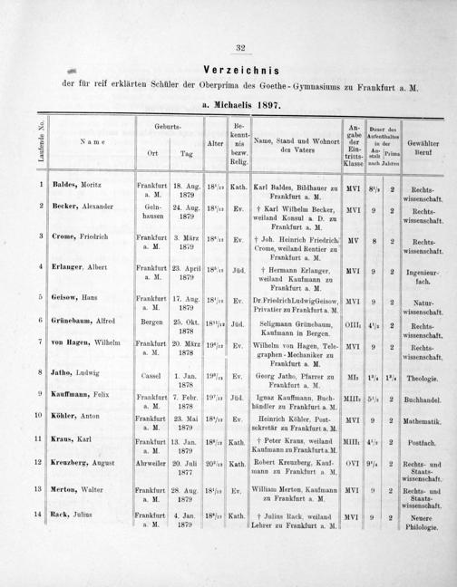 ,S Geburts- Be- An- Dauer des 2 kennt- gabe Aufenthaltes . Name Alter nis Name, Stand und Wohnort fer in der Gewählter D in- An. p,; 4 ort Tag berw. des Vaters talne An. uma Beruf 4 Relig. Klasse nach Jahren 1 Baldes, Moritz Frankfurt 18. Aug. 18 ¼l 2(Kath. Karl Baldes, Bildhauer zu Mvl 8 ½ 2 Rechts- a. M. 1879 Frankfurt a. M. wissenschaft. 2 Becker, Alexander Geln- 24. Aug. 18 ⅓1 2Ev. † Karl Wilhelm Becker, MVI9 2 Rechts- hausen 1879 weiland Konsul a. D. zu wissenschaft. Frankfurt a. M. 3 Crome, Friedrich Frankfurt 3. März 18 ⁄ 2 Ev. † Joh. Heinrich Priedrich, Mv 8 2 Rechts- a. M. 1879 Crome, weiland Rentier zu wissenschaft. Frankfurt a. M. 4 Erlanger, Albert Frankfurt 23. April 185 ⁄12%G üd. † Hermann Erlanger, MVI9 2 Ingenieur- a. M. 1879 weiland Kaufmann zu fach. Frankfurt a. M. 5 Geisow, Hans Frankfurt 17. Aug. 18 hl 2% Ev. Dr. Friedrich LudwigGeisow, MVI9 2 Natur- a. M. 1879 Privatier zu Frankfurt a. M. wissenschaft. 6 Grünebaum, Alfred Bergen 25. Okt. 1811¼1 Jüd. Seligmann Grünebaum, OIIII 4 ½ 2 Rechts- 1878 Kaufmann in Bergen. wissenschaft. 7 von Hagen, Wilhelm Frankfurt 20. März] 19 12G Ev. Wilhelm von Hagen, Tele- MvI9 2 Rechts- a. M. 1878 graphen-Mechaniker zu wissenschaft, Frankfurt a. M. 8 Jatho, Ludwig Cassel 1. Jan. 19 ⁄2mEv. Georg Jatho, Pfarrer zu Ml⸗ 1 ¾ 1%⅜ Theologie. 1878 Frankfurt a. M. 9 Kauffmann, Felix Frankfurt 7. Febr. 19 ⁄120% Jüd. Ignaz Kauffmann, Buch- MIII. 5 ½ 2 Buchhandel. a. M. 1878 händler zu Frankfurt a. M. 10 Köhler, Anton Frankfurt 23. Mai 18 ⁄12⁴*h Ev. Heinrich Köhler, Post. MvI 9 2 Mathematik. a. M. 1879 sekretär zu Frankfurt a. M. 11 Kraus, Karl Frankfurt 13. Jan. 18 8⁄2 Kath. † Peter Kraus, weiland MIIII 4 ½ 2 Postfach. a. M 1879 Kaufmann zu Frankfurt a. M. 12 Kreuzberg, August Ahrweiler 20. Juli 20 ⁄2 Kath. Robert Kreuzberg, Kauf. OVI 9 ¾ 2 KsStha, au 1877 mann zu Frankfurt a. M. Staats- wissenschaft. .1.— 13 Merton, Walter Frankfurt 28. Aug. 18 ⁄: Ev. Müuan Martan. Kslücwhdn MVI9 2 Rechts, und a. M. 1879 2u Panllntt a. Al. wissenschaft. 14 Rack, Julius Frankfurt 4. Jan. 18 16 Kath. † Julius Rack, weiland Mvl 9 2 Nevere a. M. 1879 I Lehrer zu Frankfurt a. M. Philologie.