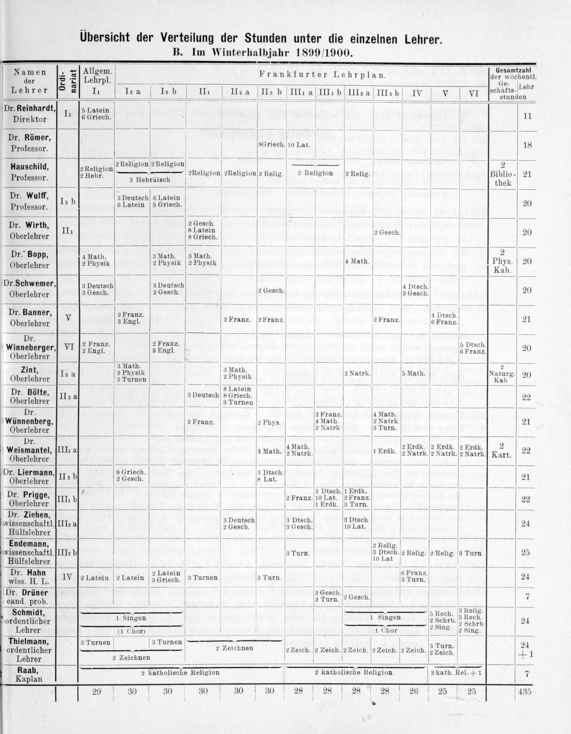 —————————— ‧ſſſſ desamtzahl Namen Allgem. Frankfurter Lehrplan. datssaeant.. der S 5 Lehrpl. Ge. Lel Lehr Lehrer 21. Lza 12 b II II. a II. b III a III b III2 a IIIIe b IV]v[VI ſSchätks,, Dr. Reinhardt, II ſs Latein Direktor ¹[6 Griech. 11 Dr. Römer V 4 4 öö“ Hrotessor. V V SGriech. 10 Lat. 18 —— Zn Hauschild, 2Religion 2 Religion 2Religion— 2 Professor. 2 Hebr.— N eReligion 2Religion2 Relig. 2 Religion 2 Relig. V Bihlüpe 21 —————————— Dr. Wulff, 12 b 3 Deutschſé Latein 4 Professor. 2 6 Latein 5 Griech. 20 ——— Dr. Wirth, 2 Gesch. II1 s Latein 3 Oberlehrer s Griech. V 2Gesch. 20 — 4————,——————————— Dr. Bopp, 4 Math 3 Math. 3 Math. V 2 Oberlehrer 2 Physik 2 Physik 2 Physik 4 Math. V 3 20 ab. ————————— Dr. Schwemer, 3 Deutsch 3 Deutsch 5 ZeSch. 4 Dtsch. 20 Oberlehrer 3 Gesch. 2 Gesch. 2 Gesch. 3 Gesch. 5 ————————— Dr. Banner, 2 Franz V . 2.— Dtsch GOberlehrer V 3 Engl. 2 Franz. 2 Franz. V 2 Franz. 6 Franz. 21 . öb Vnnbber er, VI3 Fraug. 2 PFran2. 5 Dtsch. 20 Oberleh ger, 2 Engl. 3 Engl. 6 Franz 2 — 3 Math.— V 5— Zint, 3 Alathe.. 2 Iz a 2 Physik 5 Math Natur 2 Oberlehrer* 3 Turnen Kens 20 5 SLatein 1 Dr. Bölte,[IIe a 3 den s Griech. V 22 Oberlehrer..urnen“ Dr. 2Franz. 4 Math. 1“ Wünnenberg, 2 Franz V 2 Phys. 4 Math. 2 Natrk. 21 Oberlehrer 2 Natrk 3 Turn. Dr. ö,,.““ 5 weismantel,[IIE a Nach. ¹ Nachh. lErdk. NrdM. 2 Trak rak. ²2. 22 1 31 2 Natrk.„FdGR. 2 Natrk. 2 Natrk. 2 Natrk. 2 Oberlehrer U Kart. Dr. Liermann s Griech. 3 Dtsch. Oberlehrer II b 2 Gesch. 8 Lat. 21 5„ 11 z Dtsch. 1 Erdk. ö Vr. Arloge, IIII b 2 Prans teat 2 ſran. 22 rlehrer 1 Erdk. 3 Turn. Dr. Ziehen, ö V 8Znnͤ ; 3 Deutsch 3 Dtsch. 3 Dtsch 5 vissenschaftl.III2 a 2 Gesch. 3 Gesch. 10 Lat. V 24 Hülfslehrer——— Endemann, 2 Relig. vissenschaftl. IIIe b 3 Turn. 3 Dtsch. 2 Relig. 2 Relig. 3 Turn. 25 Hülfslehrer o lat V Dr. Hahn atein 6 Franz. ,1. IV[2 Latein 2 Latein h. 3 Turnen 3 Turn. 3 24 Dis H. L. I4 din n ein 3Griec——— 2— 3—— r. Drüner ² Gesch 7 cand. prob. 2 wurn. 2 Geseh. 7 Schmidt,—— 8— nech. 3 Kells..— ordentlicher 1 Singen 1 dinsen 2 Sehrb. 1 24 Lehrer(1 6bo—— 1 Ghor ² Sins.„ Sing. Thielmann, 3 Turnen 3 Turnen. 2 7 2 Zei 3 Turn. 24 ordentlicher 2 Zeichnen 2 Zeich. 2 Zeich. 2 Zeich. 2 Zeich. ² Zeich. 2zaieh. 41 Lehrer 2 Zeichnen Haabe 2 katholische Religion 2 katholische Religion. 2 kath. Rel.+ 1 7 29 30 30 30 30 30 28 28 28 28 26 25 2 435 „ 4