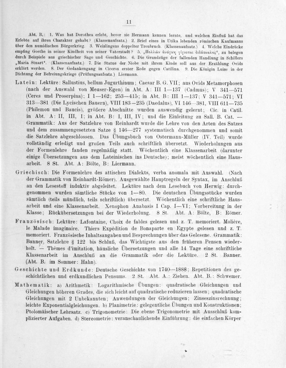 Abt. B.: 1. Was hat Dorothea erlebt, bevor sie Hermann kennen lernte, und welchen Einfluß hat das Erlebte auf ihren Charakter gehabt?(Klassenaufsatz.) 2. Brief eines in Utika lebenden römischen Kaufmanns über den numidischen Bürgerkrieg. 3. Weislingens doppelter Treubruch.(Klassenaufsatz.) 4. Welche Eindrücke empfing Goethe in seiner Kindheit von seiner Vaterstadt? 5.„IIo*νμ νvννmν †νεuνι εεν⁴‿νιαηας, zu belegen durch Beispiele aus griechischer Sage und Geschichte. 6. Die Grundzüge der fallenden Handlung in Schillers „Maria Stuart“.(Klassenaufsatz.) 7. Die Statue der Niobe mit ihrem Kinde soll aus der Erzäühlung Ovids erklärt werden. 8. Der Gedankengang in Ciceros erster Rede gegen Catilina. 9. Die Königin Luise in der Dichtung der Befreiungskriege(Prüfungsaufsatz.) Liermann.