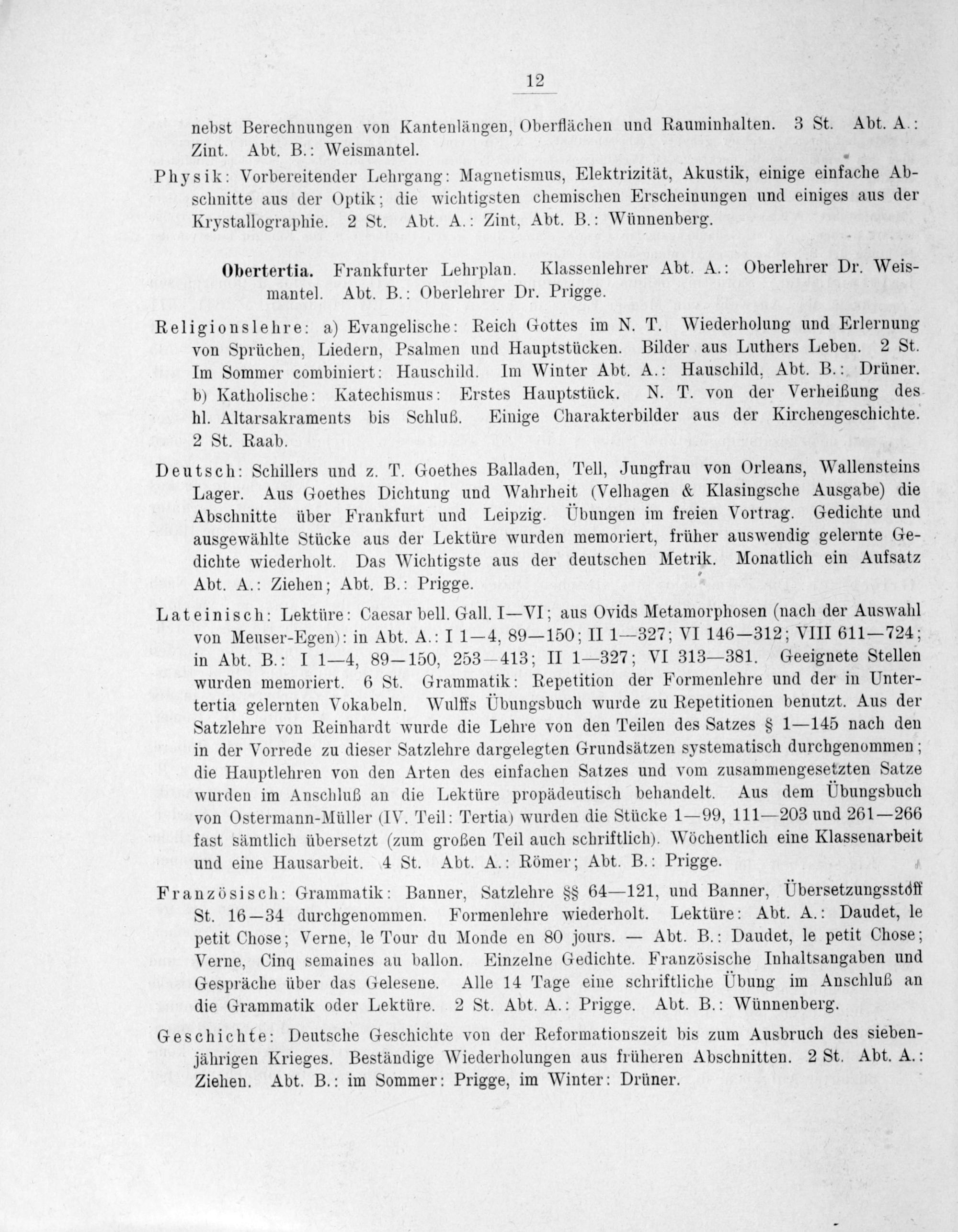 Obertertia. Frankfurter Lehrplan. Klassenlehrer Abt. A.: Oberlehrer Dr. Weis- mantel. Abt. B.: Oberlehrer Dr. Prigge.