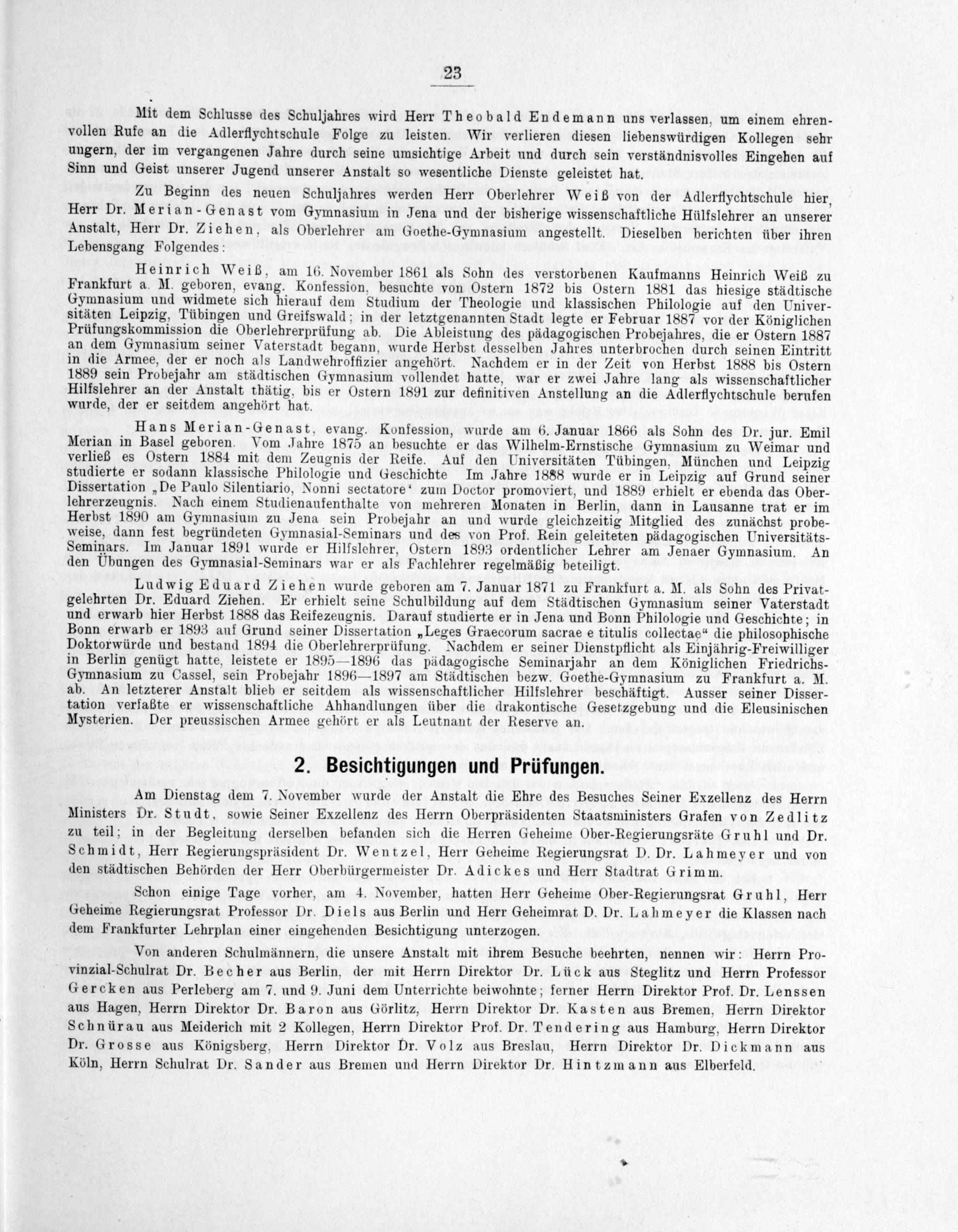 Heinrich Weiß, am 16. November 1861 als Sohn des verstorbenen Kaufmanns Heinrich Weiß zu Frankfurt a. M. geboren, evang. Konfession, besuchte von Ostern 1872 bis Ostern 1881 das hiesige städtische Gymnasium und widmete sich hierauf dem Studium der Theologie und klassischen Philologie auf den Univer- sitäten Leipzig, Tübingen und Greifswald; in der letztgenannten Stadt legte er Februar 1887 vor der Königlichen Prüfungskommission die Oberlehrerprüfung ab. Die Ableistung des pädagogischen Probejahres, die er Ostern 1887 an dem Gymnasium seiner Vaterstadt begann, wurde Herbst desselben Jahres unterbrochen durch seinen Eintritt in die Armee, der er noch als Landwehroffizier angehört. Nachdem er in der Zeit von Herbst 1888 bis Ostern 1889 sein Probejahr am städtischen Gymnasium vollendet hatte, war er zwei Jahre lang als wissenschaftlicher