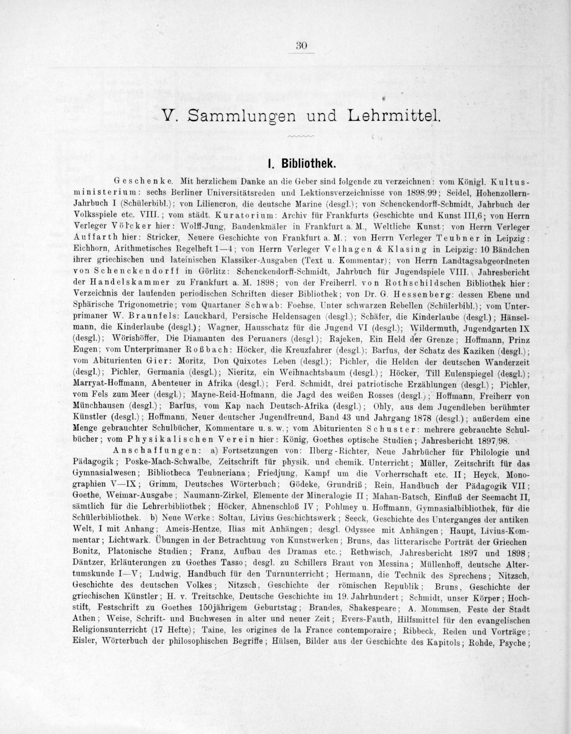 Geschenke. Mit herzlichem Danke an die Geber sind folgende zu verzeichnen: vom Königl. Kultus- ministerium: sechs Berliner Universitätsreden und Lektionsverzeichnisse von 1898/99; Seidel, Hohenzollern- Jahrbuch I(Schülerbibl.); von Liliencron, die deutsche Marine(desgl.); von Schenckendorff-Schmidt, Jahrbuch der Volksspiele etc. VIII.; vom städt. Kuratorium: Archiv für Frankfurts Geschichte und Kunst III,6; von Herrn Verleger Vörcker hier: Wolff-Jung, Baudenkmäler in Frankfurt a. M., Weltliche Kunst; von Herrn Verleger Auffarth hier: Stricker, Neuere Geschichte von Frankfurt a. M.; von Herrn Verleger Teubner in Leipzig: Eichhorn, Arithmetisches Regelheft 1— 4; von Herrn Verleger Velhagen& Klasing in Leipzig: 10 Bändchen ihrer griechischen und lateinischen Klassiker-Ausgaben(Text u. Kommentar); von Herrn Landtagsabgeordneten von Schenckendorff in Görlitz: Schenckendorff-Schmidt, Jahrbuch für Jugendspiele VIII. Jahresbericht der Handelskammer zu Frankfurt a. M. 1898; von der Freiherrl. von Rothschildschen Bibliothek hier: Verzeichnis der laufenden periodischen Schriften dieser Bibliothek; von Dr. G. Hessenberg: dessen Ebene und Sphärische Trigonometrie; vom Quartaner Schwab: Foehse, Unter schwarzen Rebellen(Schülerbibl.); vom Unter- primaner W. Braunfels: Lauckhard, Persische Heldensagen(desgl.); Schäfer, die Kinderlaube(desgl.); Hänsel- mann, die Kinderlaube(desgl.); Wagner, Hausschatz für die Jugend VI(desgl.); Wildermuth, Jugendgarten IX (desgl.); Wörishöffer, Die Diamanten des Peruaners(desgl.); Rajeken, Ein Held der Grenze; Hoffmann, Prinz Eugen; vom Unterprimaner Roßbach: Höcker, die Kreuzfahrer(desgl.); Barfus, der Schatz des Kaziken(desgl.); vom Abiturienten Gier: Moritz, Don Quixotes Leben(desgl.); Pichler, die Helden der deutschen Wanderzeit (desgl.); Pichler, Germania(desgl.); Nieritz, ein Weihnachtsbaum(desgl.); Höcker, Till Eulenspiegel(desgl.); Marryat-Hoffmann, Abenteuer in Afrika(desgl.); Ferd. Schmidt, drei patriotische Erzählungen(desgl.); Pichler, vom Fels zum Meer(desgl.); Mayne-Reid-Hofmann, die Jagd des weißen Rosses(desgl.); Hoffmann, Freiherr von Münchhausen(desgl.); Barfſus, vom Kap nach Deutsch-Afrika(desgl.); Ohly, aus dem Jugendleben berühmter Künstler(desgl.); Hoffmann, Neuer deutscher Jugendfreund, Band 43 und Jahrgang 1878(desgl.); außerdem eine Menge gebrauchter Schulbücher, Kommentare u. s. w.; vom Abiturienten Schuster: mehrere gebrauchte Schul- bücher; vom Physikalischen Verein hier: König, Goethes optische Studien; Jahresbericht 1897/98.