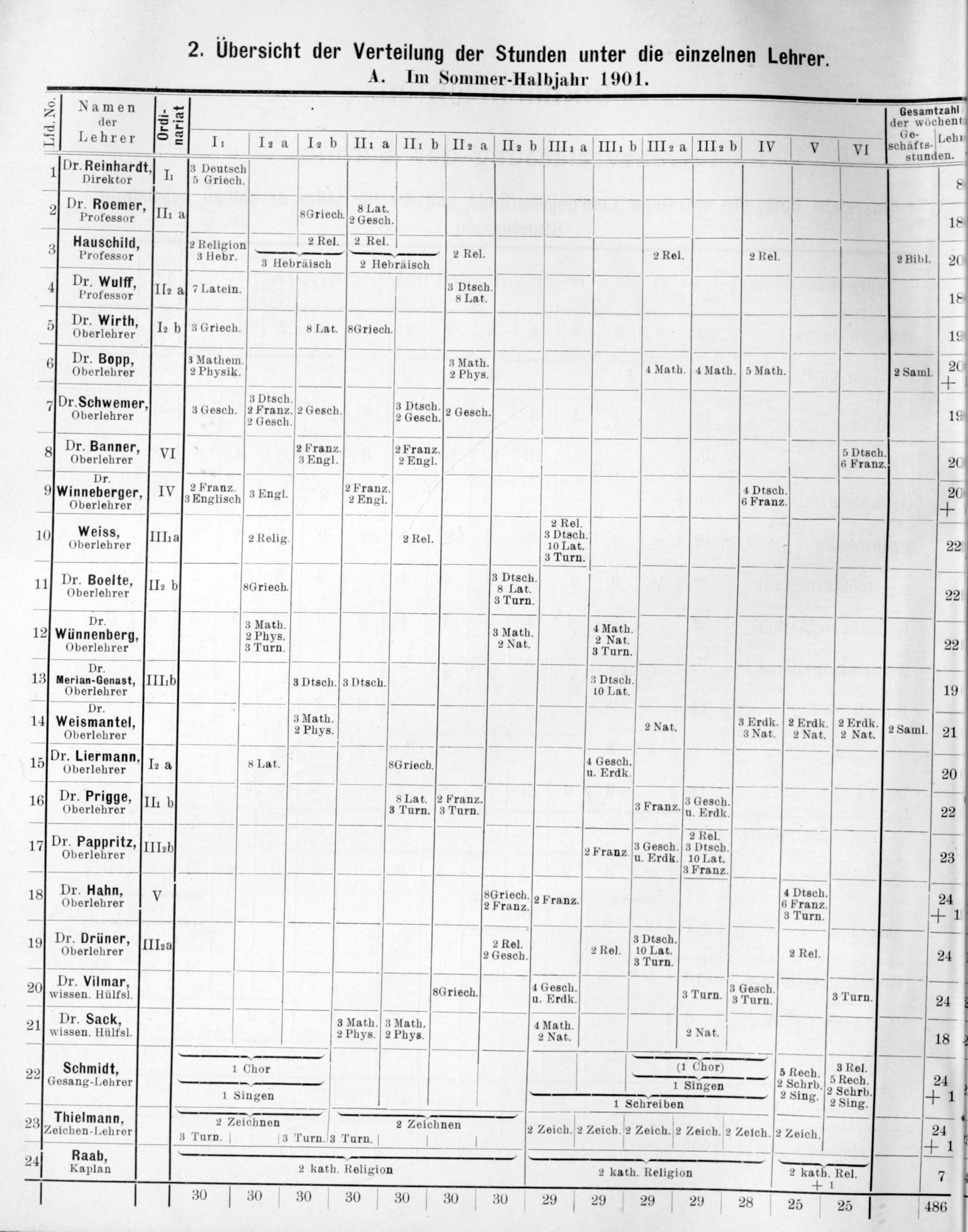 2. Ubersicht der Verteilung der Stunden unter die einzelnen Lehrer. A. Im Sommer-Halbjahr 1901. —O⏑——————————— S— Gesamtzahl — N ame n 2 2 der wöchent — S Ge- Lehr ——₰½ ſ ſ schäfts- 3Lehrer 2[bL Lz aI. b II a II1 b. II. a II. b III1 a III1 b IIIz a III2 b- IVV VI Tfioden 1[Or. Reinhardt, IL. B Deutsch Direktor 1 ſô Griech. 8 Jbr Roemer,—+—— 2 Protessor III a sGriech. 2 Gesch. 18 ——,———————— ·———.— j jgi 2 Rel. 2 Rel. 3 hauschind, 2 Relgion 2 Rel. ²Rel. 2 Rel 2 Bibl. 20 rofessor[ Hebräisch 2 Hebrâisch.— Dr. Wulff. 7 3 Dtsch. 4 Professor' IIe a 7Latein. V 8 Lat. 18 ——yᷓỹͥÿᷓÿÿᷓÖÿỹỹỹỹỹỹᷓ̃̊̊˖OꝑC——————————— 5„Dr. Wirth 2(ari 21 5„[Ia bI Griech. 8 Lat. sGriech. 19 ²—— 1 g G Dr. Rapp. kuatdem V V Ilnth. ¹ Math. 4 Matb. 5 Math. 2Saml 2 . 1 3 Dtsch. 5 3 8 1 JOr Schwemer, 3 Gesch. 2 Franz. 2 Gesch. 3 Dtsch. Gesch. 19 Oberlehrer 2 Gesch. 2 Gesch. Dr. Banner, 2 Pranz eFran⸗ 5 Dtsch. Oberlehrer' VI 3Engl. 2 Engl 6 Franz. 20 bhbr 4—— 2 Franz. 2 p. 2 Franz. 4 Dtsch. 20 9 Winnebarder. IV sEnglisch 3 Engl. 2Engl. 6 Prans+ 10 wesss, IIIia eFade. V 2 Rel brcen 2, Oberlehrer 1 5. 19 Lat —————Turn.————— 3 Dtsch Dr. Boelte 3 Iri 8 Lat 11 Oberlehrer' II2 b vorisch. 6 Turm 22 pr. a Macl. alath 12 Wwünnenberg, 2 Phys. 8 Meth. 2 Nat 22 Oberlehrer 3 Turn. 3 Turn Dr. ſͤſͤͤ 8 SE1ͤ 13 merian-Genast, IIIib 3 Dtsch. 3 Dtsch. Desoh. 19 Oberlehrer 22b. Pr. 1 5. ſſͤſſͤͤ ; 3 Math. m 3 Erdk. 2 Erdk. 2 Erdk. ½ 4 14 weismantel, 2 Phys. 2 Nat. ⁵ Nat. 2 Nat. 2 Nat.[2Saml. 21 ) Dr. Liermann 4 4 Gesch. 15 Oberlehrer„Ia a 8 Lat. SGriech. u. Erdk. 20 3Dr. Prigge SLat. 2 Franz. 2 n 3 Gesch. 16 reiBg, III b 3 Turn. 3 Turn. 3 Franz. u. Erdk. 22 o— 4 3 2 Rel. Dr. Pappritz 2 3 Gesch. 3 Dtsch.. 17 bnbpratz, IIIab ² Franz u. Erdk. 10 Lat. 23 —.. Franz. 8. . gri 4 Dtsch. 18 Br Nabe. v he eraa⸗ Lon.24 erlehrer. 3 Turn.— 1 —„9, ³ Dtsch. Dr. Drüner 2 Rel. 3 19 Oberlehrer[IIIza V 2 Gesch. 2 Re— 2 Rel. 24 201Dr. Vilmar, Alirhf Geech.! Gach. 27 4 20 wissen. Hülfs'. V sGriech. d. Prdh. 3 Turn. 3 Turn. 3 Turn. 24 211 Pr. Sacc a nath. 3 Math. aMach. 7 8 21 G issen. Hülfsl. 2 Phys. 2 Phys. 2 Nat. 2 Nat. 18 .———————— 22 Schmidt, 1 Chor(1 Chor 5Ksoh, 3eRet. 24 =desang-Lehrer V 1 Singen 2 Wlr* 2 Schrb.+ 1 — 1 Singeen 1.— 1 Sehreiben 8. 2 Sing. 3Thielmann 2 76167 2 Zeic„„.—„.— 23 I 2 Zeichnen 2 Zeichnen 2 Zeich. 2 Zeich. 2 Zeich. 2 Zeich. 2 Zeich. 2 Zeicl 24 Zeichen-Lehrer 3 Turn. 3 Turn. 3 Turn. 1.+ 1 3 Raab— 24 Kaplan 2 kath. Religion 2 kath. Religion 2 katb. Rel 7 30 30 30 30 30 30 30 29 29 29 29 28 25 25 486